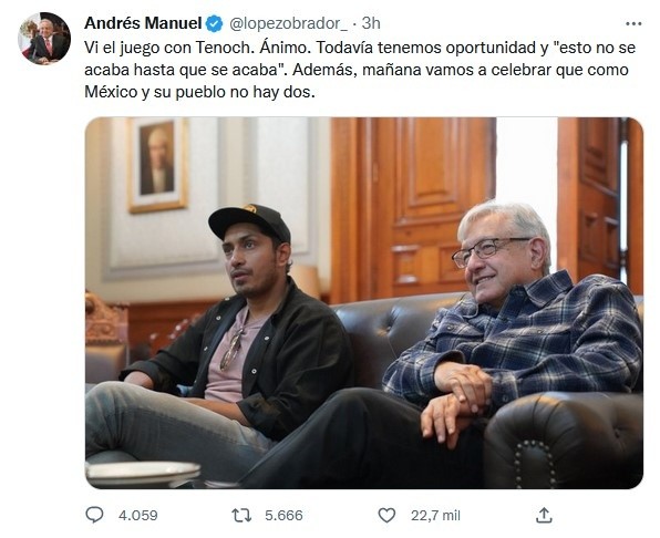 El Presidente Andrés Manuel López Obrador informó que la tarde de este sábado vio en Palacio Nacional el partido de México contra Argentina, del Mundial de Qatar 2022, en compañía del actor Tenoch Huerta.A través de sus redes sociales, López Obrador señaló que la Selección Mexicana de futbol tiene oportunidad para avanzar a los octavos de final, pues todavía resta un partido ante Arabia Saudita y "esto no se acaba hasta que se acaba".A horas de que encabece su marcha por los cuatro años de gobierno, del Ángel de la Independencia al Zócalo, López Obrador señaló que este domingo 27 de noviembre "vamos a celebrar que como México y su pueblo no hay dos"."Vi el juego con Tenoch. Ánimo. Todavía tenemos oportunidad y 'esto no se acaba hasta que se acaba'. Además, mañana vamos a celebrar que como México y su pueblo no hay dos", escribió López Obrador.Por su lado, el actor de "Wakanda Forever", compartió un mensaje en Twitter sobre la unión en Latinoamérica que resalta de este campeonato.JM