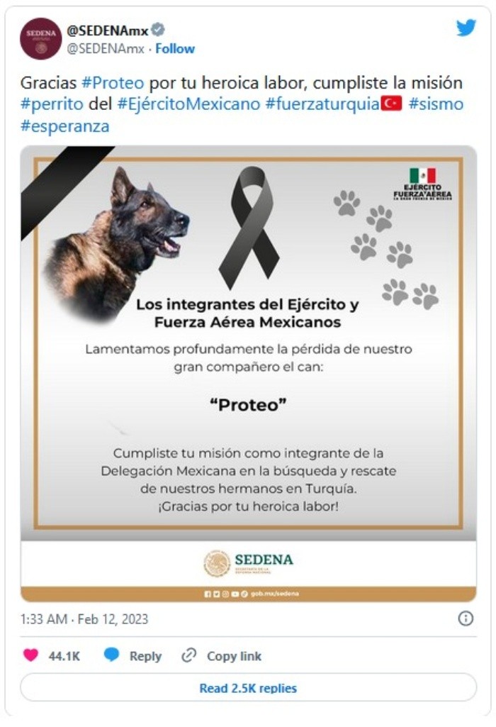 El perrito Proteo, integrante del equipo mexicano de rescatistas desplegado Turquía, que falleció esta madrugada durante el cumplimiento de sus labores, era un can de raza pastor belga.De acuerdo con la Médico Veterinaria Zootecnista (MVZ) María Antonieta Duarte, egresada de la Universidad Nacional Autónoma de México (UNAM), los perros pastores belgas son una raza activa, inteligente, de fácil entrenamiento con gran manejo en el cumplimiento de tareas designadas.Pese a su imponente apariencia, los perritos como Proteo tienen un carácter fiel, amistoso y de protección que los hace ideales para desempeñar su labor como binomios caninos de rescate.La especialista en pequeñas especies aseguró en entrevista que, desde la Edad Media, los pastores belgas eran empleados en labores de rescate, como perros cargadores, portadores de mensajes y en otras tareas durante las dos guerras mundiales.Por su naturaleza, los pastor belga son animales protectores, así que no es aconsejable fomentar sus instintos de protección sin la guía adecuada.Además, por su complexión física y cualidades, la veterinaria recomienda no considerarlos como mascotas si no se planea darles la atención, actividad y disciplina que se requiere para su manejo adecuado y bienestar.“Cumpliste tu misión como integrante de la Delegación Mexicana en la búsqueda y rescate de nuestros hermanos en Turquía. ¡Gracias por tu heroica labor!”, expresó la Secretaría de la Defensa Nacional (Sedena) en su mensaje de despedida para Proteo, el binomio canino rescatista que falleció esta madrugada en su cumplimiento de labor.Junto con 15 perritos más, Proteo viajó a Turquía para participar en las labores de rescate tras los sismos en ese país.Antes de dejar este mundo, el héroe de cuatro patas trabajó para localizar a personas bajo los escombros y, aunque no especificaron el motivo de su deceso, aparentemente ocurrió en el cumplimiento de su labor, de acuerdo con la información que la Sedena publicó a través de su cuenta de Twitter.JM