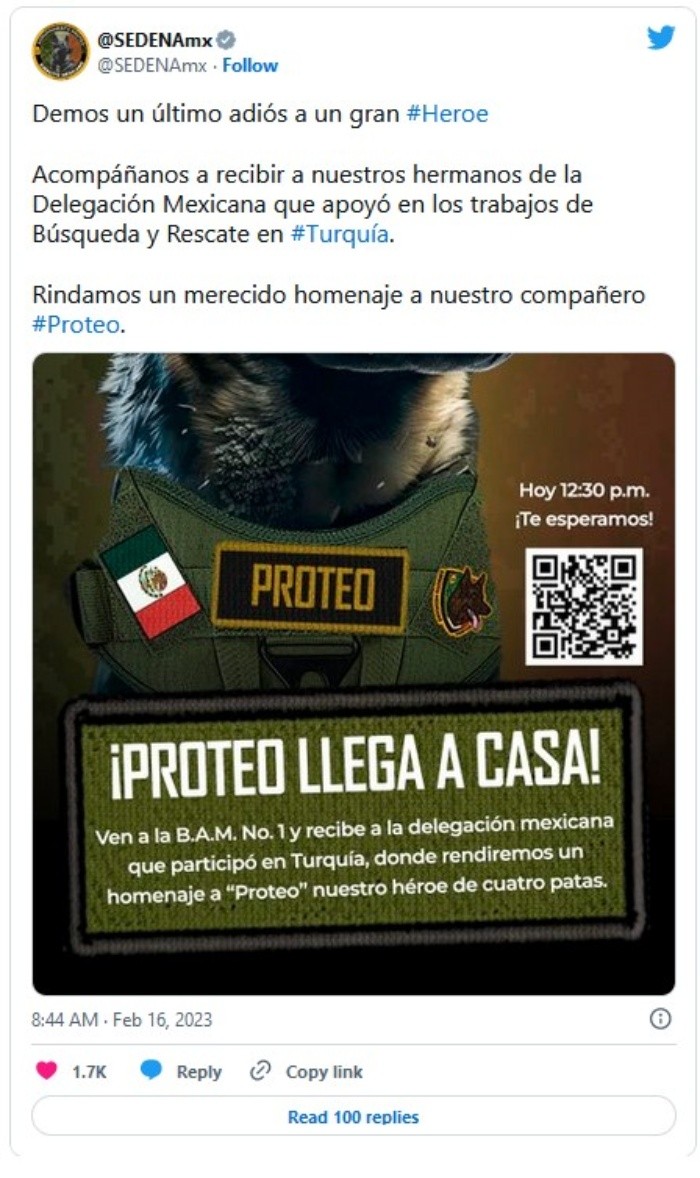 Alrededor de las 12:30 horas se tiene previsto que arribe a la Base Militar No 1 en Santa Lucía, en el Estado de México, la delegación mexicana que apoyó en los trabajos rescate en Turquía tras el sismo de 7.8 grados ocurrido el pasado 6 de febrero.En redes sociales, la Secretaría de la Defensa Nacional (Sedena) invitó a la población a que acuda a Santa Lucía para dar la bienvenida a los efectivos y rendir un homenaje a "Proteo", el héroe de cuatro patas que murió en el país del Medio Oriente."Demos un último adiós a un gran héroe. Acompáñanos a recibir a nuestros hermanos de la delegación Mexicana que apoyó en los trabajos de Búsqueda y Rescate en Turquía. Rindamos un merecido homenaje a nuestro compañero 'Proteo' ", señaló la dependencia.El perro, quien perdió la vida a las 16:45 horas del 10 de febrero de 2023, nació el 16 de junio de 2013, perteneció a la Primera Brigada de Policía Militar, en el Campo Militar No. 1-A, Ciudad de México y fue seleccionado para ser enviado a Turquía por su alto grado de adiestramiento alcanzado y su experiencia en actividades de Búsqueda y Rescate de personas.En su última labor de ayuda humanitaria en Turquía, el lomito apoyó en el rescate con vida de un menor y la recuperación de 14 cuerpos.De acuerdo con la Sedena, a las 9:47 horas del 11 de febrero del presente año (horario de Turquía) integrantes de la delegación Mexicana llevaron a cabo una ceremonia para reconocer la loable labor que realizó en beneficio del pueblo de México y de países hermanos.De acuerdo con Carlos Villeda Máquez, entrenador de "Proteo", la muerte del lomito ocurrió por diversos factores, entre ellos la edad (estaba cerca de cumplir 10 años) y el clima extremadamente frío que se mantiene en Turquía; descartó que el deceso ocurriera debido al derrumbe de un edificio como en un inicio se manejó.JM