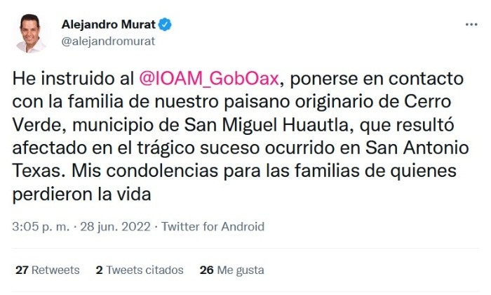 El gobernador de Oaxaca, Alejandro Murat Hinojosa, confirmó que es originario de la entidad uno de los sobrevivientes que viajaban en el trailer donde murieron 50 personas migrantes en Texas, como previamente había adelantado el canciller Marcelo Ebrard.Murat Hinojosa detalló que el joven, identificado como José Luis G., es originario de Cerro Verde, comunidad de San Miguel Huatla, municipio ubicado en la región Mixteca de Oaxaca.Por la mañana, el canciller Marcelo Ebrard informó a través de su Twitter que al menos dos de los 16 sobrevivientes que fueron rescatados del tráiler eran mexicanos, quienes estaban hospitalizados en el Texas Vista Medical Center.Agregó en un tuit que el cónsul Rubén Minutti se encontraba con los dos mexicanos, el oaxaqueño de aproximadamente unos 24 años, y una joven originaria de Chiapas y detalló que ambos estaban deshidratados, pero ya reciben atención médica.Sin embargo, posteriormente Ebrard borró el tuit e informó que aún se confirmaban las identidades de las víctimas sobrevivientes.Al respecto, el gobernador oaxaqueño confirmó que uno de los migrantes recatados con vida es originario de la entidad, por lo que instruyó al Instituto Oaxaqueño de Atención al Migrante (IOAM) para que se contactara con la familia."He instruido al @IOAM_GobOax, ponerse en contacto con la familia de nuestro paisano originario de Loma Verde, del municipio de San Miguel Huautla, resultó afectado en el trágico suceso ocurrido en San Antonio Texas. Mis condolencias para las familias de quienes perdieron la vida", publicó en Twitter.JM