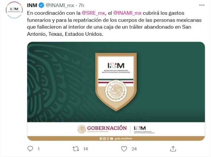 El cónsul de México en San Antonio, Texas, Rubén Minutti, afirmó este martes en conferencia de prensa que la cifra de migrantes mexicanos fallecidos en la tragedia del tráiler de San Antonio, Texas, asciende a 27.Minutti señaló que "el número de fallecidos total, al momento, es de 51, de los cuales se tiene información en donde reporta la Oficina del Médico Forense que 27 de las personas fallecidas sería presuntamente de nacionalidad mexicana porque se vinculaba algún documento de identidad". Ahora, dijo, lo que procede es verificar identidades con huellas dactilares.Hay 13 personas que permanecen hospitalizadas, de las cuales, tres son mexicanas.Los sobrevivientes fueron enviados a seis hospitales de San Antonio. Sobre su condición, Minutti dijo que "el personal médico de los hospitales han indicado que los heridos están en estado crítico, con fallas neurológicas, renales, hepáticas y con hemorragias internas".Minutti indicó además que se han recibido 30 solicitudes de familiares mexicanos que buscan a sus seres queridos que están desaparecidos, por lo que temen que estén entre las víctimas.El Instituto Nacional de Migración (INM) anunció que apoyará con gastos funerarios y la repatriación de los cuerpos de los migrantes de nacionalidad mexicana que perdieron la vida al interior de una caja de tráiler abandonada en San Antonio, Texas.En un comunicado, informó que la autoridad migratoria mantiene una estrecha coordinación con las autoridades de la Secretaría de Relaciones Exteriores (SRE) para brindar atención y respaldo a las familias mexicanas de quienes fallecieron en esta tragedia.El INM, adelantó que a través de sus oficinas de representación en los estados del país, mantendrá comunicación con los parientes de los migrantes mexicanos fallecidos, con la finalidad de que a la brevedad posible puedan recibir los restos de sus seres queridos y llevar a cabo su sepelio en los lugares de origen.JM