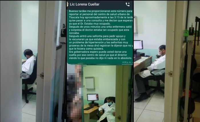 La crisis sanitaria por la pandemia de COVID incrementó el trabajo para miembros del sector Salud... pero para otros significó la oportunidad de dormir la siesta en los consultorios, como se lee en una denuncia pública en Tlaxcala.Enfermeras y pacientes evidenciaron, con fotografías, que uno de los médicos asignados al Centro de Salud Urbano de Tlaxcala de Xicohténcatl, identificado como Enrique Paredes, aprovecha parte de su jornada laboral para dormir dentro de su consultorio.Un usuario envió una queja, vía WhatsApp, a un número de denuncia dirigido a la gobernadora Lorena Cuéllar Cisneros, en la que relató el caso de una mujer embarazada y con hipertensión, a quien supuestamente le negaron la vacuna anticovid y servicios médicos con el argumento de que el doctor estaba "muy ocupado" cuando en realidad estaba dormido en su escritorio."Me proporcionaron este número para reportar el personal del Centro de Salud Urbano de Tlaxcala. Hoy, aproximadamente a las 3:15 de la tarde quise pasar a una consulta y me decían que esperara, ya que el Dr., estaba muy ocupado. Después de unos minutos, una señorita enfermera salió; y sorpresa, el doctor estaba tan ocupado que hasta roncaba. Después, entró una señorita para pedir apoyo y la vacunaran, ya que estaba embarazada y con un problema de hipertensión, y las señoritas muy groseras, de la mesa donde registran, le dijeron que no y que le hiciera como quisiera", se lee en la queja dirigida a Cuéllar Cisneros.Según el testimonio de enfermeras y pacientes que han sido testigos de la siesta, al médico no le importan las largas filas que se forman de quienes acuden en busca de la vacuna anticovid o quienes solicitan una consulta por síntomas relacionados con la enfermedad pandémica o cualquier otro padecimiento.En una de las imágenes, el médico aparece dentro del consultorio sentado sobre una silla de uso ejecutivo. Su equipo de cómputo está encendido, mientras él duerme protegido con un cubrebocas."Entre sueño y sueño, ya imaginarán qué clase de atención da. Esta situación es de años, y pasan directores y nada", sostuvo una enfermera, quien pidió reservar su identidad. La profesional de la salud aseguró que ella y otras enfermeras, e incluso pacientes que se han percatado de la siesta del médico en horario laboral, ya lo han reportado a los directivos; sin embargo, nadie interviene.El pasado 7 de diciembre emitieron otro reporte luego de que captaran al médico otra vez dormido dentro de su consultorio, a pesar de que la hora correspondía a su jornada laboral y estaba obligado a atender a los pacientes. "Se durmió en plena aplicación de la vacuna, valiéndole que hubiera tanta gente. No hemos podido mandarle esto al doctor Zamudio", expresó una enfermera.JM