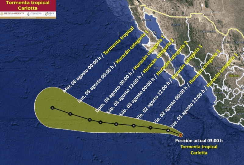 El Servicio Meteorológico Nacional (SMN), fuente climática oficial del Gobierno de México, informó esta madrugada que la tormenta tropical "Carlotta" se intensifica lentamente.Sobre su situación actual, el SMN informó que la tormenta tropical "Carlotta" continúa intensificándose, sus bandas nubosas ocasionan lluvias puntuales fuertes en Nayarit, Jalisco, Colima y Michoacán, además de oleaje elevado en las costas de dichos estados.Su distancia al lugar más cercano es a 580 km al oeste-suroeste de Playa Pérula, Jalisco, y a 630 km al oeste-suroeste de Manzanillo, Colima.Su desplazamiento es hacia el oeste-noroeste (300°) a 19 km/h. Además, mantiene vientos máximos sostenidos de 95 km/h y rachas de 110 km/h.De acuerdo al pronóstico elaborado por el SMN, se esperan lluvias puntuales fuertes (25 a 50 mm) en Nayarit, Jalisco, Colima y Michoacán, así como chubascos (5 a 25 mm) en Baja California Sur, durante la mañana.Asimismo, se prevé oleaje de 1 a 2 metros de altura en las costas de Jalisco, Colima y Michoacán, durante la mañana.Autoridades pidieron extremar precauciones a la población en general en las zonas de los estados mencionados por lluvias, viento y oleaje (incluida la navegación marítima) y atender las recomendaciones emitidas por las autoridades del Sistema Nacional de Protección Civil, en cada entidad.Se espera que este mismo jueves, "Carlotta" alcance la categoría 1 como huracán, justo cuando se encuentre a 605 km al sur-suroeste de Cabo San Lucas, Baja California Sur.Con información del Servicio Meteorológico Nacional* * * Mantente al día con las noticias, únete a nuestro canal de WhatsApp * * *OA