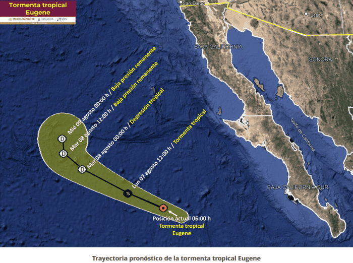 La tormenta tropical "Eugene" continúa su desplazamiento hacia el oeste-noroeste, se debilita y se aleja de la península de Baja California, informó el Servicio Meteorológico Nacional (SMN), fuente oficial del Gobierno de México en materia climática."Eugene" se encuentra a 485 kilómetros (km) al suroeste de Punta Eugenia, Baja California Sur, y a 810 km al oeste de Cabo San Lucas; en su distancia hacia el lugar más cercano en México.Además, "Eugene" tiene un desplazamiento actual hacia el oeste-noroeste (290°) a 33 km/h y mantiene vientos sostenidos de 85 km/h y rachas de 100 km/h.El SMN informó, a través de un aviso, que este sistema se desplaza rápidamente hacia el oeste-noroeste y ha dejado de afectar al territorio mexicano, pero pidió extremar precauciones en las inmediaciones del sistema por lluvias, viento y oleaje (incluida la navegación marítima), así como atender las recomendaciones emitidas por las autoridades del Sistema Nacional de Protección Civil.Se espera que la tormenta tropical "Eugene" mantenga esa condición hasta mañana martes, cuando baje de categoría a depresión tropical, cuando se encuentre a 675 km al oeste-suroeste de Punta Eugenia, BCS.Con información del Servicio Meteorológico Nacional OA