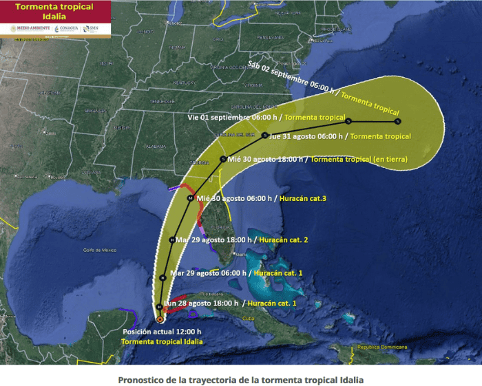 A las 09:00 horas, tiempo del centro de México, la tormenta tropical "Idalia" se localizó a 165 kilómetros (km) al este-noreste de Cozumel y a 175 km al este-sureste de Cancún, entidades de Quintana Roo. Se desplaza hacia el norte a 13 kilómetros por hora (km/h), con vientos sostenidos de 100 km/h y rachas de 120 km/h y pronto se convertiría en huracán de categoría 1 en la escala Saffir-Simpson.De acuerdo al Servicio Meteorológico Nacional (SMN), fuente oficial del Gobierno de México en materia climática, sería este mismo lunes 28 de agosto, cuando "Idalia" alcance la categoría 1 como huracán, alrededor de las 16:00 horas, cuando se encuentre a 190 km al este-noreste de Cancún, Quintana Roo y a 200 km al este-noreste de Cabo Catoche, Quintana Roo.Se espera se mantenga así hasta mañana, cuando llegue a categoría 2 y el próximo viernes llegaría a 3, para luego ir descendiendo poco a poco.Se prevén vientos con rachas de 60 a 80 km/h, oleaje de 2 a 4 metros de altura y posibles trombas marinas en las costas de Quintana Roo y Yucatán. Debido al paso de "Idalia", se esperan lluvias puntuales muy fuertes (de 50 a 75 milímetros [mm]) en Quintana Roo y fuertes (de 25 a 50 mm) en Yucatán y Campeche.El SMN, de la Comisión Nacional del Agua (Conagua), en coordinación con el Centro Nacional de Huracanes, en Miami, Estados Unidos de América, mantiene zona de prevención por efectos de tormenta tropical desde Río Lagartos, Yucatán, y hasta Tulum y Cozumel, Quintana Roo.Las precipitaciones que originará "Idalia" serán con descargas eléctricas y fuertes rachas de viento, lo que podría generar deslaves, incremento en niveles de ríos y arroyos, desbordamientos e inundaciones en zonas de los estados mencionados, por lo que se exhorta a la población a atender los avisos del SMN y seguir las recomendaciones de las autoridades estatales y de Protección Civil.Asimismo, se exhorta a la población en general, incluyendo la navegación marítima, a extremar precauciones por lluvias, viento y oleaje, así como atender las recomendaciones del Sistema Nacional de Protección Civil.Con información del Servicio Meteorológico NacionalOA