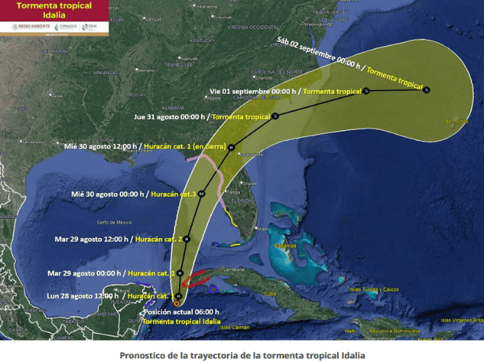 Para hoy, el centro del ciclón tropical "Idalia" se localizará frente a las costas de Quintana Roo; sus bandas nubosas generan lluvias puntuales intensas en zonas de Quintana Roo, lluvias muy fuertes en Yucatán y lluvias fuertes en Campeche, así como fuertes rachas de viento y oleaje elevado en las costas de Quintana Roo y Yucatán, informó el Servicio Meteorológico Nacional (SMN), fuente oficial del Gobierno de México en materia climática.El SMN compartió, a través de un aviso, la tormenta tropical "Idalia" se desplaza lentamente hacia el norte, intensificándose paulatinamente y acercándose a la costa occidental de Cuba, mientras mantiene probabilidad de lluvias desde chubascos hasta lluvias puntuales fuertes en la Península de Yucatán. La distancia de "Idalia" al lugar más cercano es a 160 km al este de Cozumel, Quintana Roo, a 180 km al este-sureste de Cancún, Quintana Roo, y a 150 km al sur de Cabo San Antonio, Cuba. Se mantiene zona de prevención por efectos de tormenta tropical desde Río Lagartos, Yucatán, hasta Tulum, Quintana Roo (incluido Cozumel).Mantiene vientos máximos sostenidos de 100 km/h y rachas de 120 km/h.Se espera que este mismo lunes la tormenta tropical "Idalia" alcance la categoría 1 como huracán, cuando se encuentre a 180 kilómetros al este de Cancún, Quintana Roo.Lluvias puntuales fuertes en Quintana Roo y chubascos en Campeche y Yucatán. Las lluvias mencionadas pueden ocasionar encharcamientos e inundaciones en los estados mencionados. Se pronostica viento con rachas de 60 a 80 km/h, oleaje de 2 a 4 metros de altura y posibles trombas marinas en la costa de Quintana Roo. Las lluvias pronosticadas pueden ocasionar encharcamientos e inundaciones en los estados mencionados. Extremar precauciones a la población en general en las zonas de los estados mencionados por lluvias, viento y oleaje (incluyendo la navegación marítima) y atender las recomendaciones emitidas por las autoridades del Sistema Nacional de Protección Civil, en cada entidad.Con información del Servicio Meteorológico NacionalOA