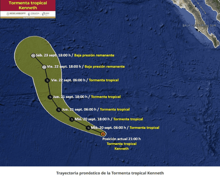 La tormenta tropical "Kenneth" continúa su desplazamiento hacia el oeste, alejándose de las costas mexicanas, informó el Servicio Meteorológico Nacional (SMN), fuente oficial del Gobierno de México en materia climática.El centro de la tormenta tropical "Kenneth" se localiza al suroeste de las costas de Baja California Sur, aunque cada momento se aleja más del territorio nacional.La distancia al lugar más cercano del sistema es a mil 535 km al suroeste de Cabo San Lucas, BCS, hasta el día de ayer. El desplazamiento actual es hacia el oeste (270°) a 20 km/h. Mantiene vientos máximos sostenidos de 75 km/h y rachas de 95 km/h.El SMN remarcó que debido a la distancia y trayectoria de la tormenta tropical "Kenneth", el sistema no representa peligro para territorio mexicano. Se espera que mañana, alrededor de las 18:00 horas, "Kenneth" disminuya su categoría a baja presión remanente, cuando se localice a mil 520 km al oeste-suroeste de Punta Eugenia, BCS.Con información del Servicio Meteorológico Nacional OA