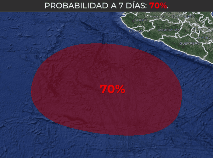 Las condiciones para que se forme la tormenta tropical "Norma" en el Océano Pacífico comienzan a ser óptimas. Este sábado 14 de octubre, la posibilidad se incrementó, según señaló el Servicio Meteorológico Nacional (SMN), fuente climática oficial del Gobierno de MéxicoA través de un aviso, el SMN informó sobre este fenómeno natural que mantiene la atención de las autoridades meteorológicas:"Se prevé la formación de una zona de baja presión al sur de las costas de Michoacán y Guerrero. Mantiene 70% de probabilidad para desarrollo ciclónico en 7 días".Ayer, el sistema rondaba en el 50% de posibilidad, por lo que en un día ha elevado esto en 20 por cuento.A partir del lunes 16 de octubre, el centro de baja presión con probabilidad de desarrollo ciclónico se desplazará al sur de las costas de Oaxaca, Guerrero, Michoacán y Colima, su amplia circulación reforzará el potencial de lluvias intensas en los estados del Pacífico Sur y Central Mexicano.Lunes 16 de octubre:Martes 17 de octubre:Durante la próxima semana, se prevé que el centro de baja presión, con probabilidad de desarrollo ciclónico, se intensifique a un posible ciclón tropical, el cual continuará desplazándose al sur de las costas del Pacífico Central Mexicano.Lo importante de este fenómeno natural es que, de continuar su evolución, se podría desarrollar un nuevo ciclón tropical que llevaría el nombre de "Norma"."Norma" es el siguiente ciclón tropical de la temporada 2023 que se desarrollaría en el Pacífico, de una estimación de entre 16 y 22.asta ahora, han existido 5 tormentas tropicales, 2 huracanes con categoría 1 ó 2, y 6 huracanes categorías 3, 4 ó 5; siendo el mayor con categoría 4 "Lidia", que impactó en las costas de Jalisco y Nayarit, y que además de los daños materiales que ocasionó, dejó 2 víctimas mortales, una en cada estado.Con información Servicio Meteorológico NacionalOA