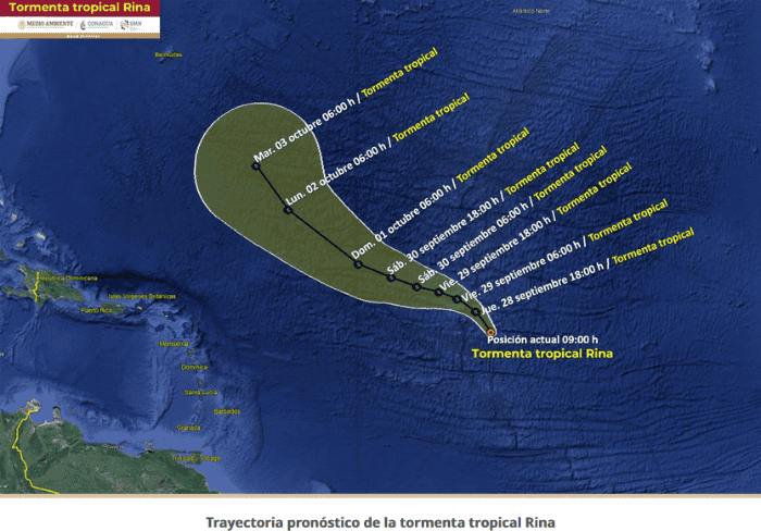 Ayer se formó la tormenta tropical "Rina" sobre el Océano Atlántico Central, muy lejos de México, según informó el Servicio Meteorológico Nacional (SMN), fuente oficial del Gobierno de México en materia climática.Hasta anoche, "Rina" se encontraba a mil 915 km al este de las Antillas Menores y a 4 mil 400 km al este de las costas de Quintana Roo, aunque debido a su distancia y trayectoria, el sistema no representa peligro para territorio mexicano. Se espera que el sistema mantenga su categoría como tormenta tropical, por lo menos, hasta el martes 03 de octubre, cuando se encuentre aún más lejos del territorio nacional, a 2 mil 960 km al este-noreste de Cancún, Quintana Roo.El pronóstico para la península de Yucatán es que se espera cielo nublado la mayor parte del día con probabilidad de lluvias y chubascos por la mañana, además de posibles bancos de niebla. Por la tarde, lluvias puntuales muy fuertes con descargas eléctricas en Campeche, Yucatán y Quintana Roo, mismas que podrían generar aumento en los niveles de ríos y arroyos e inundaciones en Campeche, así como encharcamientos e inundaciones en Yucatán y Quintana Roo. Ambiente cálido durante la mañana y muy caluroso en la tarde. Viento de dirección variable de 10 a 25 km/h con rachas de hasta 30 a 50 km/h en costas de la región y oleaje de 1 a 2 metros de altura.Con información del Servicio Meteorológico NacionalOA