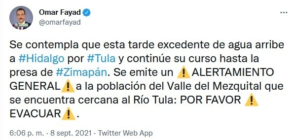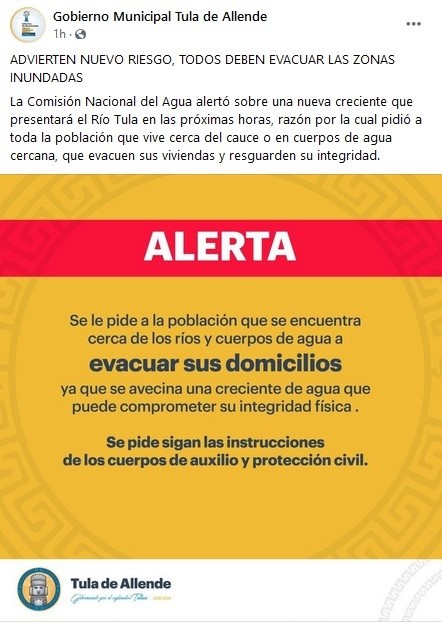 Autoridades de Hidalgo emitieron una alerta y llamaron a la población a evacuar por el riesgo de nuevas inundaciones en las zonas cercanas al río Tula, incluido el municipio del mismo nombre afectado ayer por intensas lluvias y donde murieron 14 pacientes de un hospital del IMSS."Se contempla que esta tarde excedente de agua arribe a Hidalgo por Tula y continúe su curso hasta la presa de Zimapán, por lo que se emite un ALERTAMIENTO GENERAL a la población del Valle del Mezquital que se encuentra cercana al Río Tula: POR FAVOR, EVACUAR", dijo hoy el gobernador de Hidalgo, Omar Fayad.A través de sus redes sociales, Fayad explicó que la Comisión Nacional del Agua (Conagua) informó que se realiza un desfogue en la presa Danxhó, ubicada en Jilotepec, Estado de México, y el excedente de agua se dirigirá al Río Tula, lo cual, en conjunto con posibles lluvias en el Valle de México, "representa un riesgo de inundación similar al de los días recientes".Por ello hizo un llamado a los habitantes del Valle del Mezquital, cercanos al Río Tula, a evacuar sus viviendas de manera inmediata para salvaguardar la vida.Fayad pidió a la población de la zona dirigirse a los refugios temporales en los distintos municipios y mantenerse informados a través de medios oficiales de comunicación.El gobierno municipal de Tula también alertó a sus habitantes para proceder a la evacuación.El Instituto Mexicano del Seguro Social (IMSS) ajustó hoy la cifra de pacientes fallecidos en un hospital de Tula luego de las inundaciones en el municipio.El 7 de septiembre, el Gobierno federal un saldo de 16 muertos y luego el Presidente Andrés Manuel López Obrador se refirió a 17.El director general del instituto, Zoé Robledo, dijo este 8 de septiembre que en el Hospital General de Zona con Medicina Familiar del IMSS en Tula, murieron 14 personas durante la inundación. De las 14 víctimas mortales, dos eran mujeres y 12 hombres, con un promedio de edad de 61 años.Agregó que ayer también murieron dos pacientes, pero horas antes de la inundación y por motivos distintos. Si te interesó esta noticia y quieres saber más, entonces descarga y descubre INFORMAPlus, la aplicación digital de EL INFORMADOR, en donde tenemos contenidos exclusivos, seleccionados por nuestros editores, para darles una experiencia más completa a los lectores. Descarga la aplicación y pruébala GRATIS por treinta días. Para iOS: https://apple.co/35jaVgbPara Android: https://bit.ly/3gwVSEVSi eres suscriptor de EL INFORMADOR tu acceso está incluido, solicítalo al 33 3678-7777IM