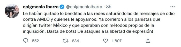 Luego de que la mañana de este viernes Twitter notificara a los empleados que "reducirá la fuerza laboral global", según un memorando interno sin firmar visto por el medio especializado The Verge, el periodista Epigmenio Ibarra dijo que "ya corrieron a los panistas".Por medio de Twitter, el productor celebró el despido masivo que realizó la red social."Le habían quitado lo benditas a las redes saturándolas de mensajes de odio contra AMLO y quienes le apoyamos. Ya corrieron a los panistas que dirigían Twitter México y que operaban con métodos propios de la inquisición", se lee en el tuit.Asimismo, sentenció: "¡Basta de bots! ¡De ataques a la libertad de expresión!"El diputado morenista Gerardo Fernández Noroña lamentó el presunto despido de trabajadores de Twitter con sede en México, tras la llegada de Elon Musk a la empresa. "En cuanto trabajadores, lamento el despido en @twittermexico; pero de que eran culebras, eran bien culebras", señaló el diputado, quien en algunas ocasiones ha sido bloqueado de la red social. JM