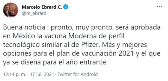 México aprobará "muy pronto" la vacuna de la farmacéutica Moderna contra el COVID-19, la cual tiene un perfil tecnológico similar a la de Pfizer, informó este sábado el canciller mexicano Marcelo Ebrard."Buena noticia: pronto, muy pronto, será aprobada en México la vacuna Moderna de perfil tecnológico similar al de Pfizer", indicó el funcionario en su cuenta oficial de Twitter.Asimismo, dijo que esto presenta "más y mejores opciones" para el plan de vacunación de México en lo que resta del año y el que ya se diseña para 2022.Además, informó que hasta ahora México ha recibido un total de 73.7 millones de dosis de seis farmacéuticas que han enviado embarques al país desde el 23 de diciembre de 2020.Tan sólo esta mañana arribaron un millón de dosis de Sinovac, con lo que se espera continuar con el plan de vacunación que hasta el corte de este viernes sumaba más de 37.3 millones de personas vacunadas, lo que representa el 42 % de la población mayor de 18 años.Esto va en línea con el objetivo del Gobierno de México que ha reiterado en diversas ocasiones su meta de tener vacunados a todos los mayores de 18 años en octubre, al menos con una primera dosis.El pasado martes, ante la evidente tercera ola de contagios de covid-19, el Gobierno de México insistió en que el avance de la vacunación en el país está frenando tanto las defunciones como los ingresos hospitalarios, y no anunció ninguna medida adicional de restricción social.Por ello, las autoridades de salud han apostado por la vacunación como una medida para mitigar la letalidad de la pandemia que suma más de 2.6 millones de casos confirmados y rebasa las 236 mil muertes debido al coronavirus.México se mantiene como el cuarto país del mundo con más muertes por COVID-19, detrás de Estados Unidos, Brasil y la India, y es decimosexto en número de contagios confirmados, según el recuento de la Universidad Johns Hopkins. OF