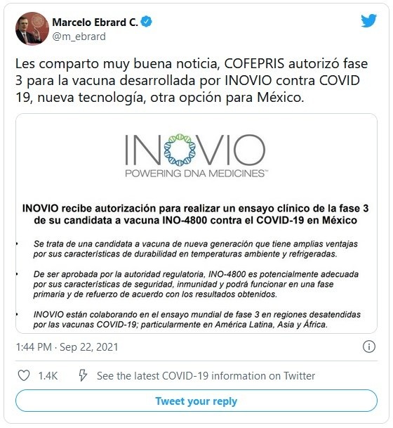 El secretario de Relaciones Exteriores, Marcelo Ebrard, anunció que la Comisión Federal para la Protección contra Riesgos Sanitarios (Cofepris) autorizó este miércoles la fase tres del ensayo clínico de la vacuna contra anticovid de Inovio.A través de un mensaje en Twitter, el canciller manifestó que la candidata a vacuna, Ino-4800, representa "nueva tecnología, otra opción para México".De acuerdo con la explicación, la dosis de la farmacéutica estadounidense presenta una alta resistencia a temperaturas ambiente y refrigeradas.También se explicó que de ser aprobada por la autoridad regulatoria, el biológico podrá funcionar en una fase primaria o de refuerzo de acuerdo a los resultados obtenidos.Destacó, finalmente, que la vacuna está siendo probada en tres regiones "desatendidas por las vacunas COVID-19", en especial en América Latina, Asia y África.La autorización del ensayo se suma a los dados a conocer por la Secretaría de Relaciones Exteriores apenas el 15 de septiembre, cuando detalló que en el país se manejaban un total de ocho ejercicios de este tipo.Si te interesó esta noticia y quieres saber más, entonces descarga y descubre INFORMAPlus, la aplicación digital de EL INFORMADOR, en donde tenemos contenidos exclusivos, seleccionados por nuestros editores, para darles una experiencia más completa a los lectores. Si eres suscriptor de EL INFORMADOR tu acceso está incluido, solicítalo al 33 3678-7777.Descarga la aplicación y pruébala GRATIS por treinta días.Para iOS: https://apple.co/35jaVgbPara Android: https://bit.ly/3gwVSEVJM