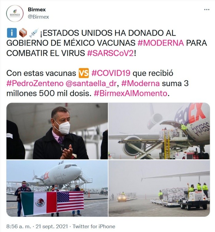 México recibió este martes de Estados Unidos el último cargamento de 1.75 millones de dosis Moderna contra el COVID-19, con lo que se completó la donación de 3.5 millones de biológicos que el Gobierno de Joe Biden se comprometió a entregar al país."La donación de la vacuna Moderna a México forma parte del esfuerzo de los Estados Unidos por distribuir vacunas seguras y eficaces al mayor número posible de personas, y con la mayor rapidez factible, en nuestra región", informó en un comunicado la embajada estadounidense en México.El donativo se anunció el pasado 10 de agosto tras una llamada entre la vicepresidenta estadounidense, Kamala Harris, y el Presidente Andrés Manuel López Obrador (AMLO), quien informó que Washington enviaría hasta 8.5 millones de dosis a México.En total, Estados Unidos ha donado a México 7.57 millones de vacunas, 3.5 millones de dosis de Moderna, y poco más de cuatro millones de fármacos de AstraZeneca.Los primeros biológicos de Moderna se utilizaron para vacunar, por ejemplo, a las personas de 18 a 29 años en el Estado de México. Además de esas dosis, este martes arribaron a México 228 mil 150 inmunizantes de la vacuna Pfizer-BioNTech.De acuerdo con autoridades de salud, hasta antes de este último arribo, México había recibido 109.4 millones de dosis de diversas farmacéuticas, como las estadounidenses Pfizer, Moderna y Johnson & Johnson, las chinas CanSino y Sinovac, la británica AstraZeneca y la rusa Sputnik V.Si te interesó esta noticia y quieres saber más, entonces descarga y descubre INFORMAPlus, la aplicación digital de EL INFORMADOR, en donde tenemos contenidos exclusivos, seleccionados por nuestros editores, para darles una experiencia más completa a los lectores. Si eres suscriptor de EL INFORMADOR tu acceso está incluido, solicítalo al 33 3678-7777.Descarga la aplicación y pruébala GRATIS por treinta días.Para iOS: https://apple.co/35jaVgbPara Android: https://bit.ly/3gwVSEVJM