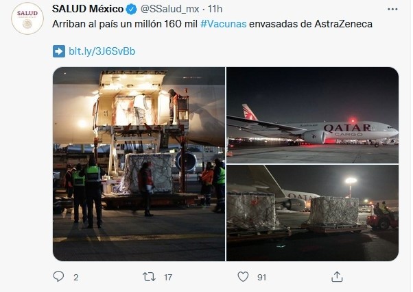 La Secretaría de Salud (Ssa) informó que arribaron al país un millón 160 mil vacunas anticovid de AstraZeneca, con lo cual la farmacéutica ha entregado a México 89 millones 279 mil 500 dosis envasadas y en sustancia activa.Desde el inicio de las adquisiciones, México ha recibido 145 millones 468 mil 795 vacunas envasadas de Pfizer-BioNTech, AstraZeneca, Sinovac, Centro Nacional de Investigación de Epidemiología y Microbiología Gamaleya, CanSino Biologics, Johnson & Johnson y Moderna.La dependencia señaló que en territorio mexicano, el laboratorio Drugmex ha envasado 14 millones 024 mil 840 dosis de CanSino Biologics, y el laboratorio Liomont 42 millones 966 mil 100 biológicos de AstraZeneca, lo que hace un total de 56 millones 990 mil 940 vacunas envasadas en el país.En suma, desde el 23 de diciembre de 2020 y hasta este día, México ha tenido disponibles 202 millones 459 mil 735 biológicos y hasta hoy se han recibido 186 embarques en 200 vuelos.JM