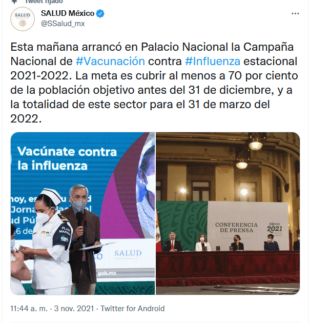 Este miércoles, la Secretaría de Salud puso en marcha la campaña nacional de vacunación contra la influenza 2021 (estacional) dirigida principalmente a grupos vulnerables y mujeres embarazadas en la cual se aplicarán 32 millones 328 mil 200 dosis.En conferencia prensa en Palacio Nacional, el subsecretario de Salud, Hugo López-Gatell explicó que la vacuna contra la influenza es segura y que puede aplicarse incluso al mismo tiempo que la vacuna contra el COVID-19."Si se pueden, enfatizo, si se pueden poner las dos vacunas, la de influenza y la de COVID al mismo tiempo y a la misma persona, por mismo tiempo me refiero que pueden ser pocos días de diferencia o incluso en el mismo momento".López-Gatell señaló que la vacuna contra la influenza se aplica para las personas que tienen el mayor riesgo de complicaciones en primer lugar los extremos edad: en el caso de influenza las personas de 60 años y más, pero también la población menor de seis meses a cinco años.Se considera como población prioritaria aquellos que tiene comorbilidades como enfermedades cardiacas o pulmonares, congénitas o crónicas, diabetes mellitus, obesidad mórbida, enfermedad pulmonar crónica como enfisema, bronquitis crónica y asma, insuficiencia renal crónica, cáncer, inmunosupresión adquirida, personas con VIH-Sida.OF
