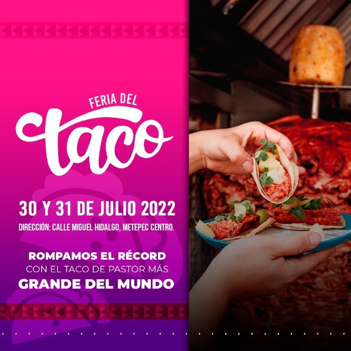 La primera edición de la Feria del Taco y el Barro se llevará a cabo el próximo 30 y 31 de julio en Metepec, donde participaran más de 40 expositores en la calle Paseo San Isidro, que se ha convertido en el Andador Turístico de las Sombrillas, indicó María Luisa García. Alacranes, hormigas y chapulines, entre otros platillos, son los que formarán parte de la propuesta alimenticia en la feria.De igual manera, el evento servirá para que los taqueros vayan por romper el récord del taco más grande, con cerca de 120 metros de largo, informó María Luisa García Colín, directora de Desarrollo Económico, Fomento Turístico y Artesanal de Metepec y Jorge Zendejas Vargas, presidente de la Asociación de Taqueros del Estado de México.Se busca fusionar lo gastronómico con la actividad artesanal en esta primera edición, toda vez que el 29 de julio es el Día del Barro en este Pueblo Mágico en el que hay un padrón de 486 artesanos con manos mágicas, indicó García Colín.En la feria habrá desde los tradicionales tacos de cecina, suadero, chorizo hasta los exóticos de jabalí, alacrán, jumiles, de gusano de maguey, "tacos locos" y veganos; asimismo, celebrarán el concurso del Rey del Taco que será el sábado 30 de julio a las 15:00 horas, donde premiarán a la persona que coma más tacos, indicó Jorge Zendejas. Cabe resaltar que el taco más grande de México está planeado para medir de 110 a 120 metros de largo, longitud que será certificada por dos notarios públicos, que contendrá unos mil 200 kilos de carne, con más de 100 kilos de tortilla, en un trabajo que realizarán cerca de 100 personas para ensamblarlo, quienes cuidarán la sanidad del taco, el cual al final será degustado por los asistentes.Para poder elaborar el taco gigante, los organizadores y participantes calculan invertir más de 100 mil pesos en los insumos, quienes buscan una certificación de Récord Guinness al tratar de superar los 102 metros de largo del Taco de Querétaro.Los organizadores indicaron que los artesanos y taqueros se capacitaron con autoridades sanitarias del Instituto de Salud del Estado de México y Protección Civil, para poder realizar esta Feria del Taco y el Barro, aún en la pandemia por COVID-19, para evitar que sea un foco de propagación y fortalecer la economía y el turismo en Metepec de manera responsable, con garantías de seguridad.MV