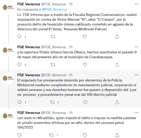 La Fiscalía de Veracruz confirmó la mañana de este miércoles que fue detenido Víctor Manuel "N", alias "El Calaco" por el homicidio de las periodistas Yessenia Mollinedo Falconi y Sheila Johana García Olivera.Además, el “Calaco” fue imputado por su presunta responsabilidad en el homicidio doloso calificado en agravio de la directora del portal "El Veraz" y la reportera Sheila, hechos ocurridos el pasado 9 de mayo del presente año en el municipio de Cosoleacaque.“El imputado fue previamente detenido por elementos de la Policía Ministerial mediante cumplimiento de mandamiento judicial”.Además, se indicó que se le imputó el delito e impuso la medida cautelar de prisión preventiva oficiosa por un año, dentro del proceso penal 156/2022.Yesenia Mollinedo Falconi y Sheila Johana García Olvera fueron asesinadas a tiros el pasado 9 de mayo.Testigos de los hechos detallaron que ambas viajaban en un auto compacto y cuando se encontraban en el estacionamiento de una tienda de conveniencia fueron atacadas a tiros.GC