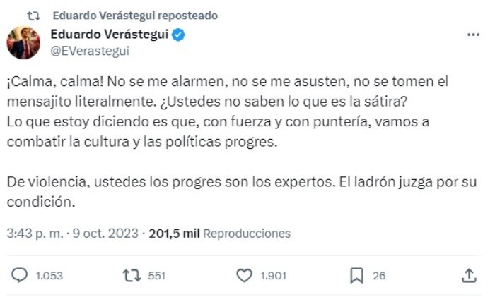 Eduardo Verástegui, candidato independiente a la presidencia México ha generado controversia en redes sociales luego de que a través de su perfil de la red social X, compartiera un video en el que envía una amenaza y llama terroristas a la comunidad comunidad LGBTTTIAQ+ y a los ambientalistas.En dicha publicación se le ve al también actor sosteniendo un rifle y disparando a un objetivo el cual es acompañado del siguiente texto:“Miren lo que le vamos a hacer a los terroristas de la agenda 2030, del cambio climático y de la ideología de género. Los leo”Hasta el momento el video cuenta con 2 millones y medio de reproducciones y ha generado un sin fin de comentarios con los que los usuarios de esta red social le han dejado en claro la indignación que sienten así como su rechazo. Tania Morales, presidenta de la Asamblea Consultiva del Consejo para Prevenir y Eliminar la Discriminación de la Ciudad de México (Copred) no dudó en comentar y hacer un llamado al Instituto Nacional Electoral para tomar cartas en el asunto:“Veamos si INE aplica lineamientos para suspender registros de aspirantes a puestos de elección popular, cuyas campañas se basan en amenazar la vida de defensores y defensoras de derechos humanos. #DefensoresDH”, escribió.Han sido tantas las criticas y comentarios negativos que ha recibido que Verástegui decidió postear de nueva cuenta en esta misma red social un mensaje en su defensa, mencionando que su publicación fue una sátira y dando una breve explicación sobre a lo que realmente se refería con el texto anterior.Sin embargo las críticas no disminuyen, al contrario, siguen haciendo comentarios en los que desaprueban sus actos, incluso afirman que una sátira es su candidatura a la presidencia e incluso lo llaman extremista.YC