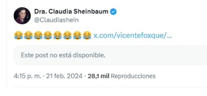 La candidata presidencial de la coalición Sigamos Haciendo Historia, Claudia Sheinbaum, respondió con un emoji a la publicación del expresidente Vicente Fox que cuestionaba su convicción para ser presidenta de México.Sheinbaum reaccionó a la publicación de Fox con un emoji que indica risa, como si estuviera riéndose a carcajadas ante el comentario.Lo anterior después de que Vicente Fox escribió en su cuenta de "X" que Claudia Sheinbaum tiene poca aspiración para ser presidenta del país, ni personalidad ni cualidades o capacidades.Además, Fox añadió que Sheinbaum tiene poca convicción democrática, libertaria, y cero compromisos con quienes menos tienen en México.Luego de los comentarios, la candidata a la presidencia de México por parte de Morena decidió responder con los emojis riéndose, sin embargo, Fox eliminó la publicación inmediatamente.MF