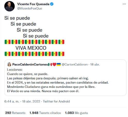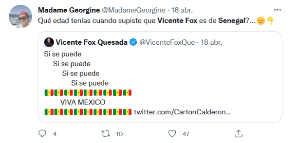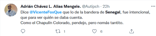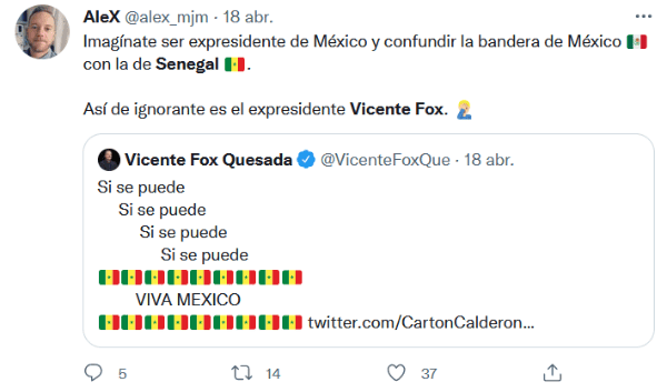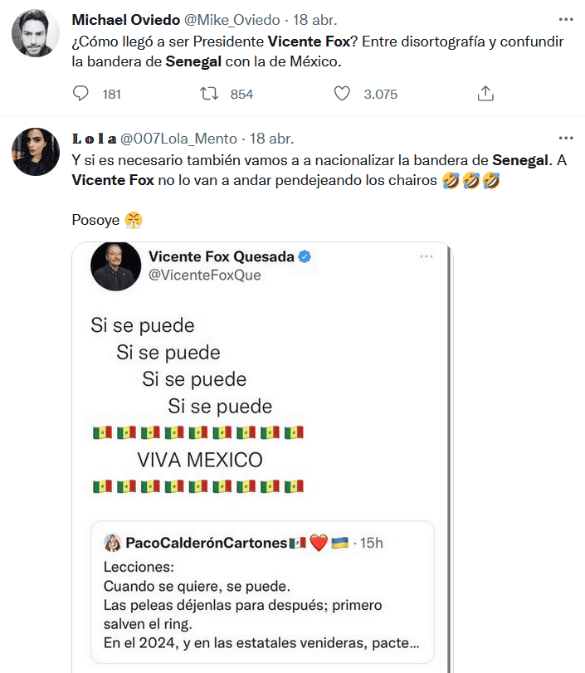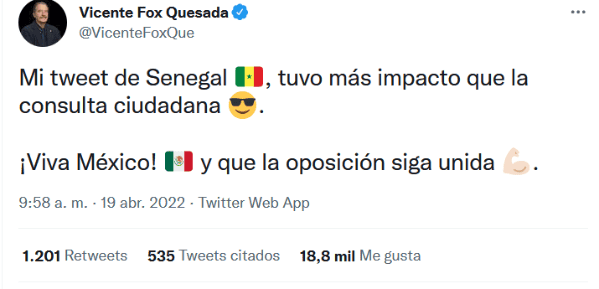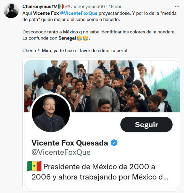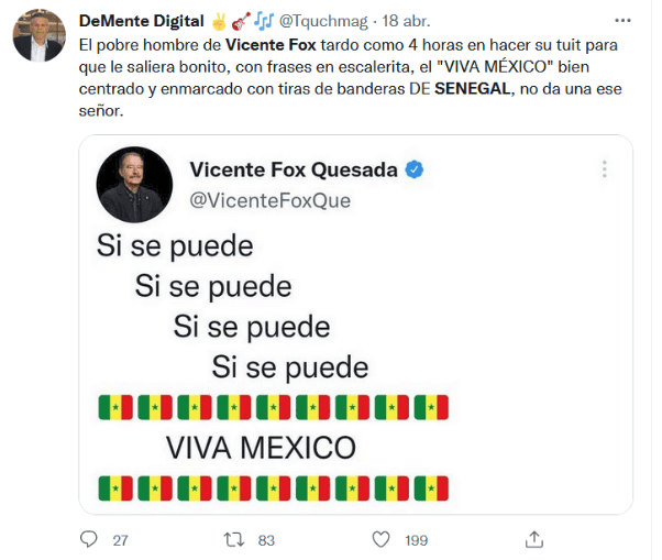 Lo que sería un tuit de celebración, terminó siendo un motivo de burla, y es que el ex presidente, Vicente Fox, fue protagonista de decenas de memes luego de confundir la bandera de México con la de Senegal. El pasado lunes, Fox retuiteó un mensaje donde celebraban que la Cámara de Diputados rechazó la iniciativa de reforma eléctrica del Presidente Andrés Manuel López Obrador, sin embargo, cometió un “pequeño” error, pues en vez de poner los emojis de la bandera de México, puso los de Senegal. Por supuesto que este hecho no iba a pasar desapercibido por los usuarios de redes sociales, que inmediatamente comenzaron a compartir memes y hasta pedirle que dejara Twitter. Después del furor de burlas por su error, Vicente Fox volvió a Twitter para criticar al Gobierno de López Obrador, y ahora sí, utilizó el emoji correcto de la bandera de México."Mi tweet de Senegal , tuvo más impacto que la consulta ciudadana . ¡Viva México! y que la oposición siga unida", escribió Fox. gc