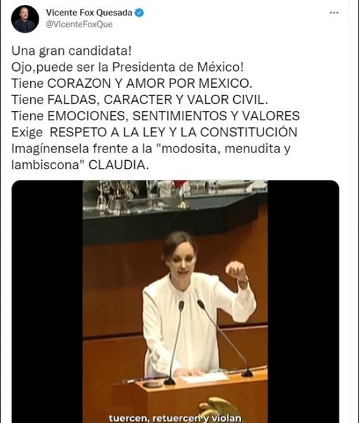 En el marco del debate de las reformas a la Guardia Nacional en el Senado de la República, el expresidente mexicano Vicente Fox Quesada aplaudió la participación de la legisladora Lilly Téllez en contra de la iniciativa. A través de Twitter, Fox Quesada mostró su apoyo hacia la senadora del Partido Acción Nacional y auguró que sería una gran candidata y presidente de México. “Una gran candidata! Ojo, puede ser la Presidenta de México! Tiene CORAZON Y AMOR POR MEXICO. Tiene FALDAS, CARACTER Y VALOR CIVIL. Tiene EMOCIONES, SENTIMIENTOS Y VALORES Exige RESPETO A LA LEY Y LA CONSTITUCIÓN”, escribió el empresario. Pero eso no fue todo: en el tuit que difundió, también atacó a la actual jefa de Gobierno de la CDMX, Claudia Sheinbaum a la que llamó "modosita y menudita". “Imagínensela (a Lilly Téllez) frente a la " modosita, menudita y lambiscona "Claudia” expresó.En el Pleno del Senado, la senadora de Acción Nacional refirió que los legisladores de la bancada de Morena piensan y asumen su trabajo sólo para el Presidente Andrés Manuel López Obrador. Esto fue lo que le respondió a la senadora Lucy Meza.“Usted piensa y asume su trabajo sólo para el Presidente de la República. Yo no soy plurinominal, yo no le debo al Presidente de la República estar aquí, se lo debo a los ciudadanos que votaron por mí y eso es exactamente lo que ustedes deberían de hacer. Les repito que ustedes son los súbditos del pejelagarto, angustiados, suplicantes por una reunión con el Presidente, aunque sea sin comida como dijeron por ahí”, expresó.JM