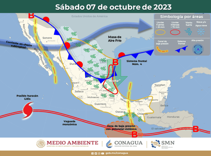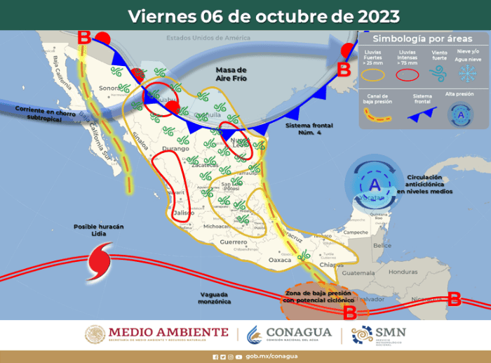 Una nueva masa de aire frío afectará a gran parte del territorio nacional, principalmente al norte, y tendrá repercusiones en las condiciones climáticas, informó el Servicio Meteorológico Nacional (SMN), fuente oficial del Gobierno de México.Aquí más detalles al respecto:El jueves, el sistema frontal Núm. 4 se mantendrá sobre la frontera norte de México, interaccionará con un canal de baja presión que se extenderá sobre el noreste de la República Mexicana y con la corriente en chorro subtropical, originando lluvias muy fuertes a puntuales intensas en dichas regiones, además de rachas fuertes de viento y posibilidad de formación de torbellinos o tornados en zonas de Coahuila, Nuevo León y Tamaulipas. Asimismo, un canal de baja presión en el sureste del territorio nacional, una zona de inestabilidad con probabilidad de desarrollo ciclónico al sur de las costas de Oaxaca y Chiapas, aunado al ingreso de humedad del Océano Pacífico, Golfo de México y Mar Caribe e inestabilidad en niveles altos de la atmósfera, provocarán chubascos y lluvias fuertes a muy fuertes sobre entidades del occidente, centro, oriente, sur y sureste del país, incluyendo el Valle de México y la Península de Yucatán. Por su parte, el ciclón tropical "Lidia" se desplazará al sur de las costas de Baja California Sur, sus desprendimientos nubosos reforzarán el potencial de lluvias en el occidente de México.El viernes, el sistema frontal Núm. 4 será reforzado por una nueva masa de aire frío y se extenderá sobre el norte de la República Mexicana, interaccionará con un canal de baja presión que se extenderá sobre el noreste del territorio nacional, con inestabilidad en niveles altos de la atmósfera y con la corriente en chorro subtropical, ocasionando lluvias muy fuertes a puntuales intensas en dichas regiones; por su parte, la masa de aire frío favorecerá un descenso de las temperaturas sobre entidades de la Mesa del Norte. A su vez, un canal de baja presión en el sureste de México, en interacción con una zona de baja presión con probabilidad de desarrollo ciclónico que se desarrollará al sur de las costas de Guatemala, Chiapas y Oaxaca, además del ingreso de humedad del Océano Pacífico, Golfo de México y Mar Caribe, propiciando lluvias fuertes a muy fuertes en el oriente, sur y sureste del país, así como chubascos en la Península de Yucatán. Por otra parte, inestabilidad en niveles altos de la atmósfera y el ingreso de humedad del Océano Pacífico, originarán probabilidad de chubascos y lluvias fuertes a muy fuertes en el occidente y centro de México, pronosticándose lluvias puntuales intensas en zonas de Durango, Sinaloa, Nayarit y Jalisco. Finalmente, el ciclónico tropical "Lidi"a continuará desplazándose al sur de las costas de Baja California Sur, su circulación favorecerá el ingreso de humedad hacia el occidente del territorio nacional, reforzando el potencial de lluvias en dicha región.El sábado, el sistema frontal Núm. 4 se extenderá sobre el norte, noreste y oriente del territorio nacional, se combinará con inestabilidad en niveles altos de la atmósfera y con la corriente en chorro subtropical, propiciando lluvias fuertes a muy fuertes en las mencionadas regiones, pronosticándose lluvias puntuales intensas en zonas de Tamaulipas, San Luis Potosí, Querétaro, Hidalgo, Puebla y Veracruz; la masa de aire frío que le dará impulso ocasionará evento de “Norte” en las costas de Tamaulipas y Veracruz, así como un descenso de las temperaturas sobre entidades de la Mesa del Norte. Por otra parte, un canal de baja presión en el sureste del país, en interacción con una zona de baja presión con probabilidad de desarrollo ciclónico al sur de las costas de Oaxaca y Chiapas, aunado al ingreso de humedad del Océano Pacífico, Golfo de México y Mar Caribe, ocasionarán lluvias muy fuertes a puntuales intensas en el sur y sureste del territorio nacional, incluida la Península de Yucatán, además de rachas fuertes de viento y oleaje elevado en las costas de Chiapas y Oaxaca. Asimismo, inestabilidad en niveles altos de la atmósfera y el ingreso de humedad del Océano Pacífico, originarán probabilidad de lluvias fuertes a muy fuertes en el occidente y centro del territorio nacional, incluido el Valle de México, previéndose lluvias puntuales intensas en Oaxaca. Finalmente, el ciclón tropical "Lidia# se desplazará al sur-suroeste de las costas de Baja California Sur, su circulación favorecerá el ingreso de humedad hacia el occidente del país, reforzando el potencial de lluvias en la región.Los sistemas meteorológicos mencionados ocasionarán los siguientes efectos:Con información del Servicio Meteorológico NacionalOA