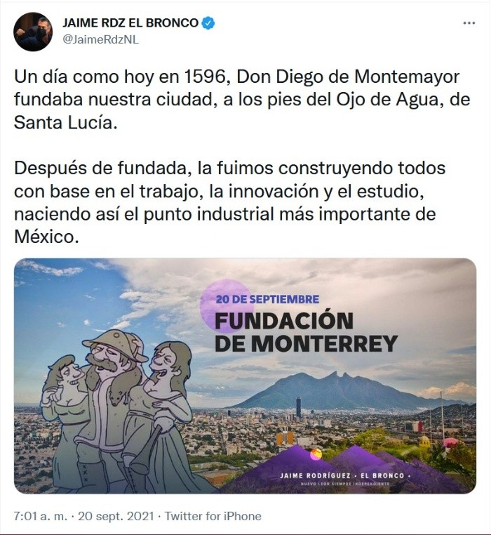 Una vez más, como tantas otras ocasiones a lo largo de su sexenio, el gobernador de Nuevo León, Jaime Rodríguez Calderón, sacudió las redes sociales a escasas dos semanas de que concluya su gobierno, al publicar con motivo del aniversario de la fundación de esta ciudad, la imagen de Shelbybille, un personaje de la popular serie de Los Simpson, que defendía poder casarse con las primas "porque están muy bonitas".Y es que recientemente ha ganado fuerza la versión de que en Monterrey "se casan entre primos", porque supuestamente los fundadores y las primeras generaciones de la ciudad preferían tener descendencia entre parientes antes que mezclarse con los nativos, y en años más recientes algunas familias ricas acordarían matrimonios entre los de su misma sangre para evitar la división de su fortuna."El Bronco", quien dejará el cargo de gobernador el próximo tres de octubre, ha sido polémico por sus ocurrencias y expresiones provocadoras o con sentido del humor. Este lunes con motivo del aniversario de la fundación de la ciudad, un 20 de septiembre de 1596, el gobernador compartió un mensaje donde afirmó que después de fundada Monterrey "la fuimos construyendo todos con base en el trabajo, la innovación y el estudio, naciendo así el punto industrial más importante de México".No por nada, afirmó, mucha gente viene aquí buscando el "sueño mexicano". Este día, recalcó, "siéntanse más orgullosos de ser regiomontanos, porque podrán decir muchas cosas de un regio, pero el privilegio de vivir en Monterrey ya lo quisieran muchos".Pero lo que sacudió las redes sociales y generó múltiples comentarios, fue que, en lugar de utilizar algún gráfico para representar a Diego de Montemayor, fundador de la ciudad, Rodríguez Calderón usó al personaje de Los Simpson, Shelbybille, que defendía el derecho a casarse con las primas, y en la imagen aparece en medio de dos mujeres que lo abrazan.Si te interesó esta noticia y quieres saber más, entonces descarga y descubre INFORMAPlus, la aplicación digital de EL INFORMADOR, en donde tenemos contenidos exclusivos, seleccionados por nuestros editores, para darles una experiencia más completa a los lectores. Si eres suscriptor de EL INFORMADOR tu acceso está incluido, solicítalo al 33 3678-7777.Descarga la aplicación y pruébala GRATIS por treinta días.Para iOS: https://apple.co/35jaVgbPara Android: https://bit.ly/3gwVSEVJM