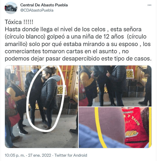 En redes sociales se volvió viral la noticia de que una niña de 12 años fue golpeada por una mujer celosa que la señaló de estar viendo a su esposo en la Central de Abasto de la Ciudad de Puebla.La agresora, quien le rompió la nariz a la menor, fue asegurada por comerciantes y entregada a la Policía Municipal de Puebla.En las redes sociales de la Central de Abasto se denunció que la mujer "tóxica" golpeó, por celos, a la menor de edad."Tóxica !!!!! Hasta donde llega el nivel de los celos, esta señora golpeó a una niña de 12 años solo por qué estaba mirando a su esposo, los comerciantes tomaron cartas en el asunto, no podemos dejar pasar desapercibido este tipo de casos", explicaron.En tanto, la Secretaría de Seguridad Ciudadana del Municipio reportó la detención de la mujer, señalada del presunto delito de lesiones.OF