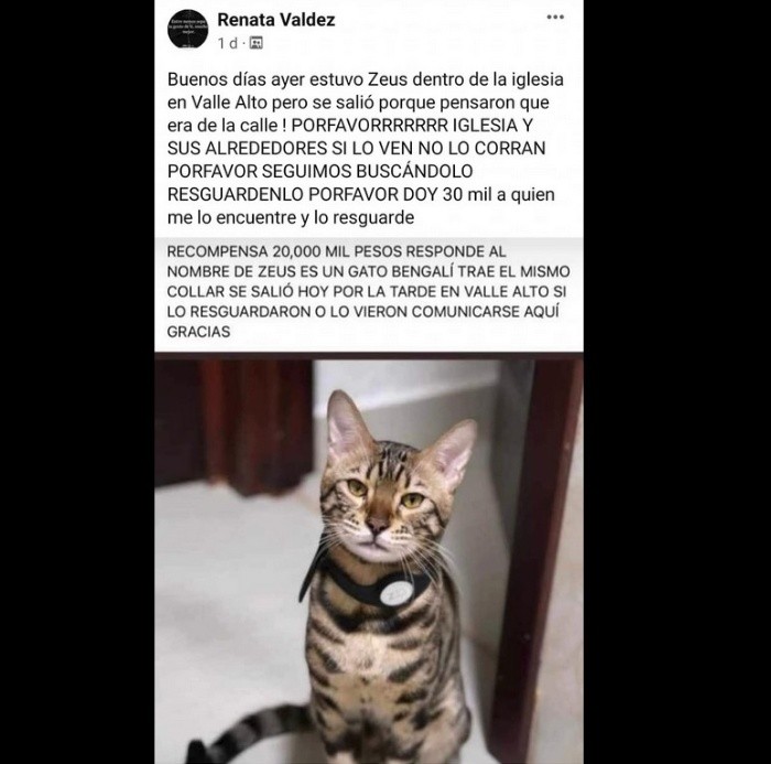 Un gatito bengalí de nombre "Zeus" se perdió en la colonia Valle Alto de Culiacán, Sinaloa. Su dueña ofrece una recompensa por su localización de 30 mil pesos. "Zeus" se perdió el pasado 18 de noviembre luego de trepar, presuntamente con otros gatos, el techo de la casa. Ya no regresó. A pesar de que el gatito porta un collar con un localizador de GPS, su dueña estableció que este no se activó.Los datos que fueron subidos a redes sociales, presuntamente por su dueña, hacen notar que "Zeus" fue visto en el templo católico de la colonia de Valle Alto, pero el personal que limpia la iglesia lo sacaron por considerar que es un animal callejero que buscaba comida.Su propietaria destacó que tiene el gatito desde pequeño y que no permite que personas ajenas se le acerquen, por lo que pide que las personas que lo vean se lo comuniquen y de ser su mascota, pagará la recompensa de 20 mil pesos, pero durante el fin de semana lo incrementó a 30 mil. Según se ha dicho en redes sociales, el precio de una mascota de ese tipo tiene un costo de entre 15 mil y 20 mil pesos.En diciembre del 2020, una familia de Culiacán ofreció entregar una recompensa de 50 mil pesos por la localización y entrega de su mascota, un pequeño French Poodle de ocho años de nombre "Blacky", el cual se extravió desde la tarde del jueves 19 de noviembre de ese año en el fraccionamiento Las Quintas.A través de redes sociales, los propietarios de este pequeño perrito, del cual se aduce está enfermo y requiere de atención médica, solicitan la colaboración de los ciudadanos para su búsqueda y localización a cambio de una recompensa de 50 mil pesos.Los datos, con la fotografía del pequeño "Blacky" divulgados, establecen que este fue visto por última vez la tarde del día 19 del mes pasado por la avenida Xicoténcatl, muy cerca de un parque del fraccionamiento las Quintas, muy cerca del centro de Culiacán.El ofrecimiento de una fuerte recompensa ha motivado diversas reacciones en las redes sociales, en las que jóvenes convocan a emprender una fuerte búsqueda de la mascota para cobrar el dinero que se ofrece.OA