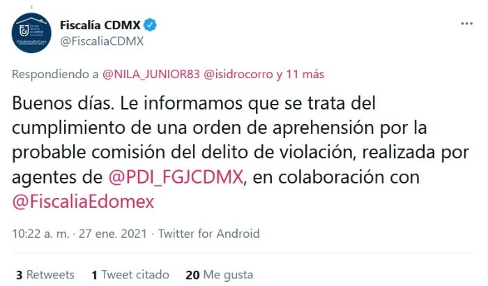 Tras la difusión de un video en el que presuntamente secuestraron a un joven en calles de Valle Ceylán, en el Estado de México, autoridades locales informaron que se trató de una orden de aprehensión presuntamente cumplimentada por autoridades de la Ciudad de México.La policía municipal recibió el llamado de vecinos de Valle Ceylán, quienes reportaron que en la calle Durango esquina con Morelia un joven que corría fue interceptado y subido a la fuerza por dos hombres a una camioneta de color gris, a parecer Nissan, que se dirigió hacia la avenida Jesús Reyes Heroles por la calle Colima.Ante este hecho, los policías municipales buscaron y dialogaron con el padre de la víctima, quien refirió que iría a buscar a su hijo a la Fiscalía General de Justicia del Estado de México de la zona para verificar si estaba detenido o en caso contrario iniciar una denuncia por la desaparición del joven de 28 años de edad.Cerca de las 22:30 horas, el padre informó a los policías municipales que había localizado a su hijo, quien se encontraba detenido en el Reclusorio Sur de la Ciudad de México.Autoridades de la Fiscalía General de Justicia del Estado de México confirmaron que el sujeto fue detenido como parte de una investigación por la violación de una menor de edad, por lo que fue trasladado a un penal de la capital del país.JM