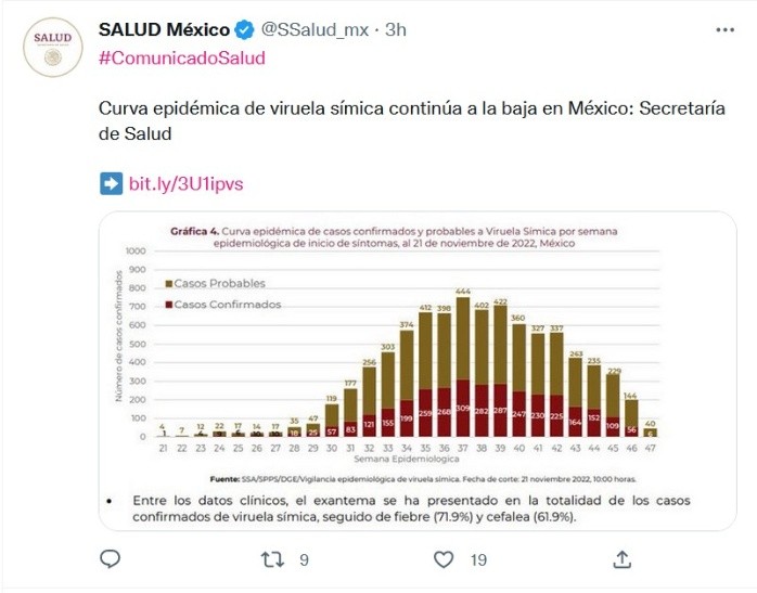 La Secretaría de Salud (SSa) reportó 40 casos confirmados de viruela símica en el país, por lo que la curva epidémica mantiene tendencia a la disminución.Detalló que entre las semanas epidemiológicas 42 y 47 disminuyó el número de casos confirmados, y de 337 bajó a 40; así como de 225 a seis probables contagios, de acuerdo al Informe Técnico Semanal de Vigilancia Epidemiológica.Desde el registro del primer caso y hasta al 21 de noviembre, se identificaron cinco mil 417 personas que cumplen la definición operacional de caso probable; de ellas, tres mil 292 fueron confirmadas, 338 se encuentran en estudio, mil 787 fueron descartadas mediante prueba de laboratorio y se registraron cuatro defunciones.El Instituto de Diagnóstico y Referencia Epidemiológicos (InDRE) notificó que los casos positivos se encuentran distribuidos en 32 entidades federativas: Ciudad de México, mil 885 contagios; Jalisco, 368; Estado de México, 334; Yucatán, 119; Quintana Roo, 124; Tabasco, 46; Puebla, 56; Nuevo León, 39; Chiapas, 35; Baja California, 26; Veracruz, 34; Querétaro, 25; Morelos, 21; Guanajuato, 17; y Sinaloa, 18.Además, Hidalgo, 17; Chihuahua, 16; Coahuila, 14; Tamaulipas, 13; Guerrero, 11; Nayarit, 10; Aguascalientes, nueve; Campeche, nueve; Oaxaca, ocho; San Luis Potosí, siete; Michoacán, siete; Tlaxcala, siete; Sonora, cinco; Colima, cuatro; Zacatecas, cuatro; Baja California Sur, dos y Durango, dos.En cuanto a la distribución por sexo, el predominio es en hombres, con 97.4%; el grupo etario de 30 a 34 años es el de mayor prevalencia, el cual presenta una tasa de incidencia de 8.5 por cada 100 mil habitantes; es decir, 874 de los tres mil 292 casos confirmados.Respecto al género de los casos confirmados que brindan información, 96.4% corresponde a masculino y 2.8%, femenino; 0.3% es no binario; 0.03%, bigénero; 0.1%, transgénero; y 0.4% corresponde a otro grupo.Los síntomas más comunes reportados son el exantema en todos los casos, que se identifica con erupción de color rojizo en la piel, y más o menos extensa; fiebre; dolores de cabeza, muscular y articular; inflamación de los ganglios linfáticos; debilidad o fatiga general que dificulta o impide realizar tareas que, en condiciones normales, realiza fácilmente; escalofríos y otros.La comorbilidad que más se presenta es el virus de inmunodeficiencia humana (VIH) en mil 925 de los casos confirmados de viruela símica; es decir, 58.5%. Le siguen sífilis y diabetes mellitus, entre otras.Se identificaron 10 defunciones, de las cuales, cuatro se relacionan directamente con la infección por el virus de la viruela símica; dos no son por esta causa directa, y cuatro se encuentran en análisis por parte de un grupo de personas expertas en infectología y epidemiología para definir si existe asociación causal entre la defunción y la infección por virus de la viruela símica.Se trata de nueve hombres y una mujer, quienes durante la atención médica presentaron lesiones compatibles con viruela símica y que, posterior al estudio de laboratorio, fueron confirmadas.Al 19 de noviembre, en el mundo se reportaron 80 mil 460 casos confirmados en 110 países, territorios y áreas en las seis regiones de la Organización Mundial de la Salud (OMS), así como 53 defunciones.JM