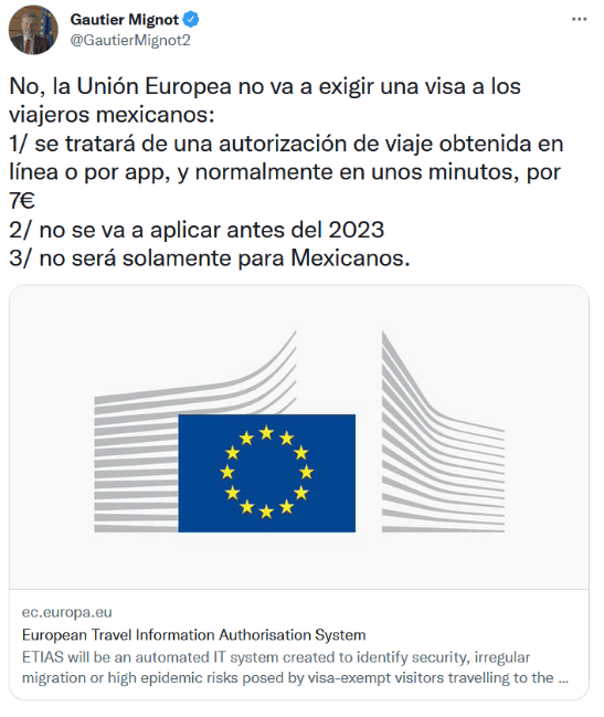 Ante los rumores de una posible visa que pedirán a los mexicanos que quieran visitar los países del Espacio Schengen a partir del siguiente año, el embajador de la Unión Europea en México, Gautier Mignot, aclaró que esto es falso."No, la Unión Europea no va a exigir una visa a los viajeros mexicanos", aclaró Mignot vía Twitter y explicó que "se tratará de una autorización de viaje obtenida en línea o por app, y normalmente en unos minutos".También recalcó, como señala la propia página donde se brinda información sobre el formulario: https://ec.europa.eu, que no se aplicará antes de 2023 y "no será solamente para mexicanos".Hasta ahora, son 60 países los exentos de requisito de visa para entrar al Espacio Shengen que deberán llenar este formulario y esperar su aprobación para poder viajar a los países europeos incluidos.Mignot detalló que el costo de este trámite será de siete euros (poco más de 146 pesos, al tipo de conversión actual).El Sistema Europeo de Información y Autorización de Viaje (ETIAS, por sus siglas en inglés) busca simplificar el proceso de autorización de entrada al Espacio Schengen. Además, se busca mejorar la seguridad fronteriza, reducir la inmigración ilegal a Europa y protección contra actividades criminales y terroristas.Una vez que entre en vigor, ETIAS permitirá a los viajeros realizar viajes a Europa de menos de 90 días cada uno por un periodo de tres años.GC