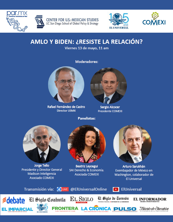 Este viernes 13 de mayo, en punto de las 11:00 horas, el Foro de Periódicos Asociados en Red (PAR) transmite el panel: "AMLO y Biden: ¿Resiste la relación?"Esta conversación puede seguirse a través de la página de EL INFORMADOR en tiempo real y es moderada por Rafael Fernández de Castro, director de USMX y Sergio Alcocer, Presidente de COMEXI.En el foro participan Jorge Tello, presidente y director general Madison Inteligencia, asociado COMEXI; Beatriz Leycegui, SAI Derecho & Economía, asociada COMEXI; y Arturo Sarukhán, exembajador de México en Washington, colaborador del El Universal.OA