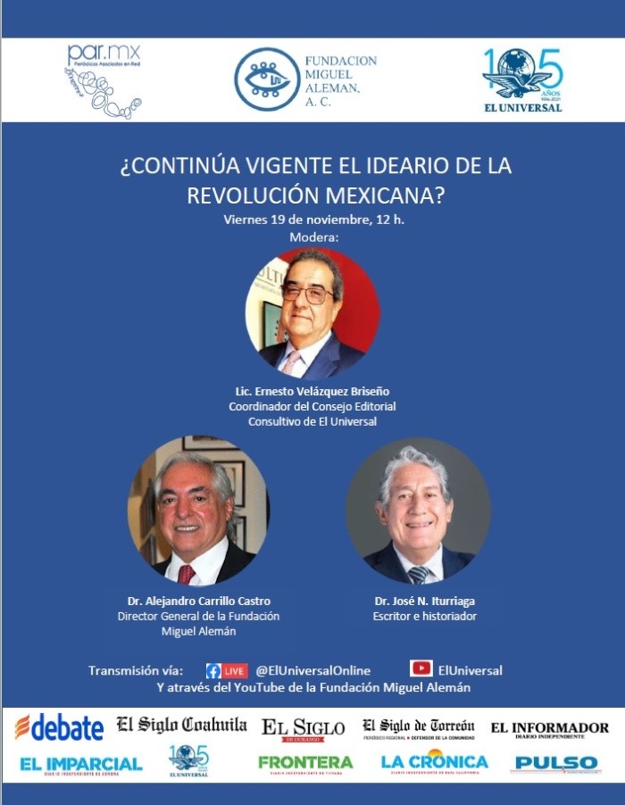 La mañana de este viernes 19 de noviembre, en punto de las 11:00 horas, comienza el análisis ¿Continúa vigente el ideario de la Revolución Mexicana? En el que participa el Lic. Ernesto Velázquez Briseño, Coordinador del Consejo Editorial Consultivo de El Universal, como moderador; el Dr. Alejandro Carrillo Castro, Director General de la Fundación Miguel Alemán y el Dr. José. N. Iturriaga, escritor e historiador.La conversación es organizada por Periódicos Asociados en Red con la colaboración de la Fundación Miguel Alemán y busca ser un espacio de reflexión para este pasaje histórico de relevancia en México.El foro puede seguirse a través de la página web de EL INFORMADOR y de sus redes sociales. OA