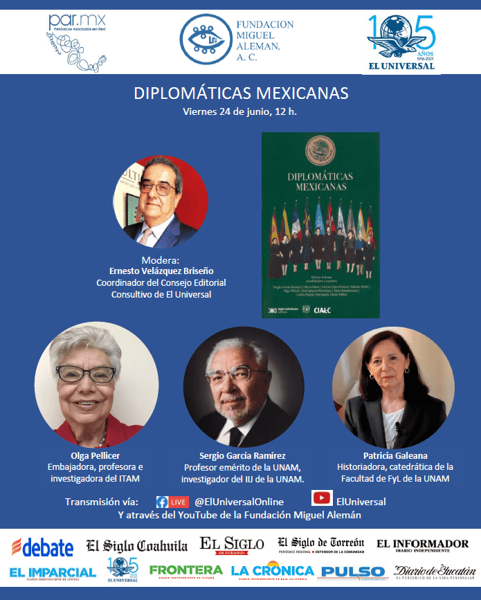 Este viernes 24 de junio, en punto de las 12:00 horas, el Foro de Periódicos Asociados en Red (PAR) transmite el panel: "Diplomáticas mexicanas".Esta conversación puede seguirse a través de la página de EL INFORMADOR en tiempo real y es moderada por Ernesto Velázquez Briseño, coordinador del Consejo Editorial Consultivo de El Universal.En el foro participan Olga Pelllicer, embajadora, profesora e investigadora del ITAM; Sergio García Ramírez, profesor emérito de la UNAM, investigador del IIJ de la UNAM; Patricia Galeana, historiadora, catedrática de la Facultad de FyL de la UNAM.OA