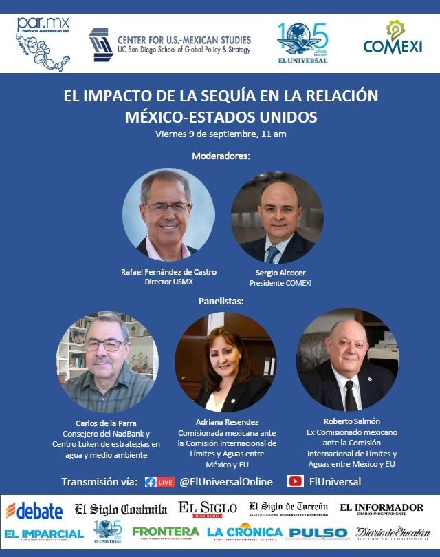 Este viernes 09 de septiembre, en punto de las 11:00 horas, el Foro de Periódicos Asociados en Red (PAR) transmite el panel: "Impacto de la sequía en la relación México-Estados Unidos".Esta conversación puede seguirse a través de la página de EL INFORMADOR en tiempo real y es moderada por Rafael Fernández de Castro, director de USMX y Sergio Alcocer, Presidente de COMEXI.En el foro participan Carlos de la Parra, consejero del NadBank y Centro Luken de estrategias en agua y medio ambiente; Adriana Resendez, comisionada mexicana ante la Comisión Internacional de Límites y Aguas entre México y EU; y Roberto Salmón, excomisionado mexicano ante la Comisión Internacional de Límites y Aguas entre México y EU.OA