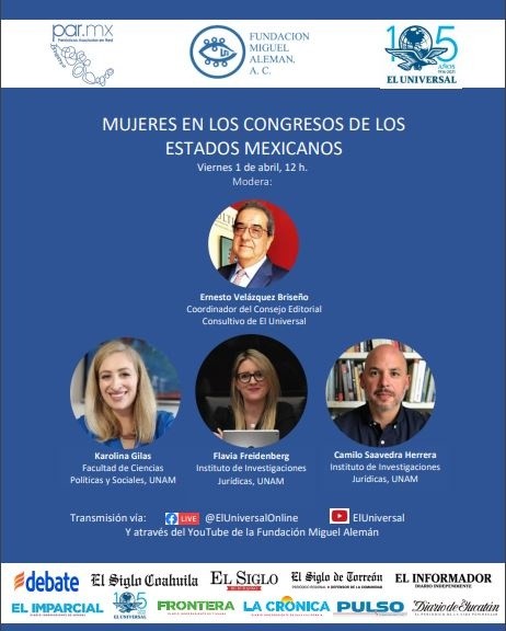 Este viernes 1 de abril, en punto de las 12 de la tarde, el Foro de Periódicos Asociados en Red (PAR) y la Fundación Miguel Alemán A.C.transmitirán el foro "Mujeres en los Congresos de los estados mexicanos".Esta conversación podrá seguirse a través de la página de EL INFORMADOR en tiempo real y será moderada por Ernesto Velázquez Briseño Coordinador del Consejo Editorial Consultivo de EL UNIVERSAL.En el foro participarán Karolina Gilas de la Facultad de Ciencias Políticas y Sociales, UNAM, Flavia Freidenberg del Instituto de Investigaciones Jurídicas, UNAM y Camilo Saavedra Herrera Instituto de Investigaciones Jurídicas, UNAM.