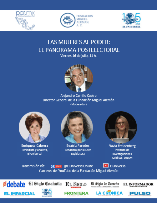 Este viernes se celebrará el foro "Las mujeres al poder: el panorama postelectoral" organizado por la Fundación Miguel Alemán A.C., el periódico El Universal y el grupo de Periódicos Asociados en Red. Alejandro Carrillo Castro, director general de la Fundación Miguel Alemán, será quien modere al grupo integrado por Enriqueta Cabrera, periodista y analista de El Universal, Beatriz Paredes, senadora del PRI y Flavia Freidenberg del Instituto de Investigaciones Jurídicas de la UNAM.Esta mesa de análisis podrá seguirse a través de la página de EL INFORMADOR en punto de las 11:00 horas.