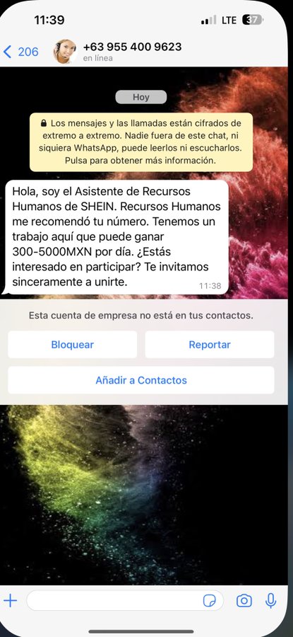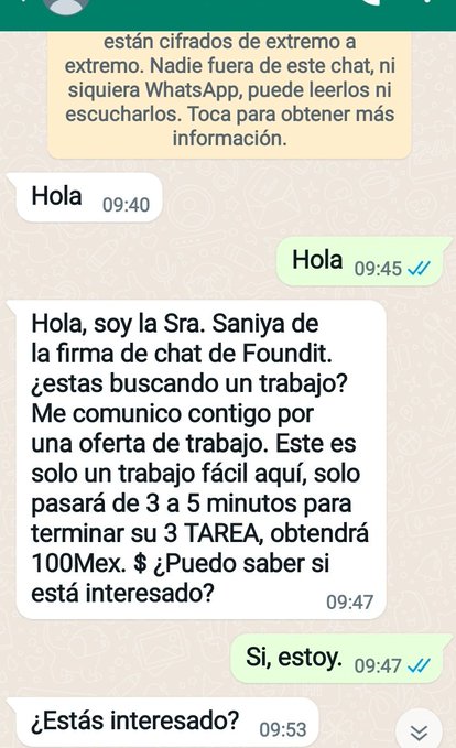 “Hola, mucho gusto. Mi nombre es... ¿puedo tomar unos minutos de su tiempo?”Este es el mensaje que miles de usuarios han estado recibiendo a lo largo de los últimos días a través de la aplicación WhatsApp. No se trata de una oferta de trabajo, sino una de las nuevas modalidades contemporáneas del fraude. El propósito es sencillo: se le ofrece a los usuarios un trabajo rápido, sin esfuerzos verdaderos, y además bien remunerado. A cambio de dar "me gusta" a determinados videos de YouTube, trabajar para SHEIN, Mercado Libre, Amazon y demás empresas conocidas, los interesados pueden ganar dinero de modo fácil, sin esfuerzo, y desde la comodidad de sus dispositivos móviles.La necesidad y la inestabilidad económica de nuestros días hacen de estos mensajes un blanco fácil para las personas, en la que el dinero siempre hace falta, por lo que es sencillo morder el anzuelo. A través de redes sociales, cientos de usuarios están reportando esta nueva modalidad de "scam" -estafa-, que se ha ido intensificando. Algunos incluso aseguran que, buscando la procedencia de los números de donde los mensajes fueron enviados, estos han llegado de lugares tan recónditos como Filipinas o Sudáfrica."Me llegó un mensaje a mi WhatsApp de que si quería trabajar en YouTube", explica Brenda, de 26 años. "Ganar $100, $200 pesos, nomás por darle "likes" a videos. Uno sabe que esos mensajes son falsos, pero hay gente más grande que puede creer que es verdad y es más fácil caer". Los mensajes circulan en torno a la misma frase: "Tengo una oportunidad de trabajo para ti, ¿puedo enviarte más detalles?" "¿Me das unos minutos para recomendarte un trabajo que te ayude a ganar dinero desde casa"?, "estamos contratando personal a tiempo parcial". Muchos de los mensajes enviados presentan constantes errores sintácticos. Si bien todavía no hay un pronunciamiento oficial al respecto, lo recomendable es nunca responder a estos mensajes, bloquear el contacto o denunciarlo como spam, debido a que una respuesta es la confirmación a los estafadores de que el número en cuestión está activo. Los fraudes avanzan día con día en todas sus modalidades, de modo que ahora más que nunca hay que estar informados y prevenidos. FS