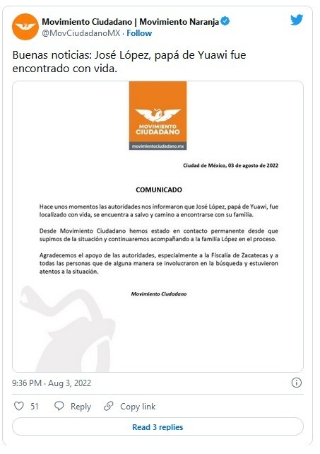 La noche de este miércoles José López, papá de Yuawi, fue localizado con vida, informó Movimiento Ciudadano a través de un comunicado."Hace unos momentos las autoridades nos informaron que José López, papá de Yuawi, fue localizado con vida, se encuentra a salvo y camino a encontrarse con su familia"."Desde Movimiento Ciudadano hemos estado en contacto permanente desde que supimos de la situación y continuaremos acompañando a la familia López en el proceso", se lee en el boletín.El partido político concluyó agradeciendo el apoyo de las autoridades, especialmente de la Fiscalía de Zacatecas, y a todos aquellos que se mantuvieron pendientes de la situación.José López Robles, papá del niño cantante del spot de Movimiento Naranja y creador del grupo musical Venado Azul, desapareció la tarde del lunes en el municipio de Valparaíso, Zacatecas. Esta privación ilegal de la libertad generó no sólo que la familia interpusiera la denuncia correspondiente, sino también Movimiento Ciudadano para que a la par se emitieran las medidas de protección pertinentes para Yuawi y su familia.Dentro de lo que se había referido públicamente es que José López viajaba en un vehículo con su esposa y un menor de edad. Ccuando transitaba por las calles de Valparaíso, una camioneta blanca les bloqueó el paso y fueron golpeados, después los sujetos se llevaron con rumbo desconocido a José López. Yuawi no viajaba con ellos, ya que se había quedado en Huejuquilla del Alto.CON INFORMACIÓN DE EL UNIVERSALJM
