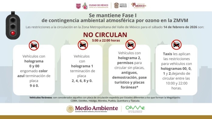 Anoche, la Comisión Ambiental de la Megalópolis (CAMe) informó que la Fase 1 de contingencia ambiental atmosférica por ozono, iniciada el jueves, se mantendrá este sábado, por lo que las restricciones como el Doble Hoy No Circula serán obligatorias en la Ciudad de México y su área conurbada.La prohibición puede generar confusión, ya que el programa varía los sábados y la contingencia agrega disposiciones adicionales. Para mayor claridad, estos son los vehículos que sí pueden circular:A las 10:00 horas de este sábado, la CAMe revisará los indicadores para determinar si la contingencia —y las restricciones asociadas— se suspenden, se mantienen o escalan a fase 2.Entre las medidas establecidas destacan:Recomendaciones a la ciudadanía