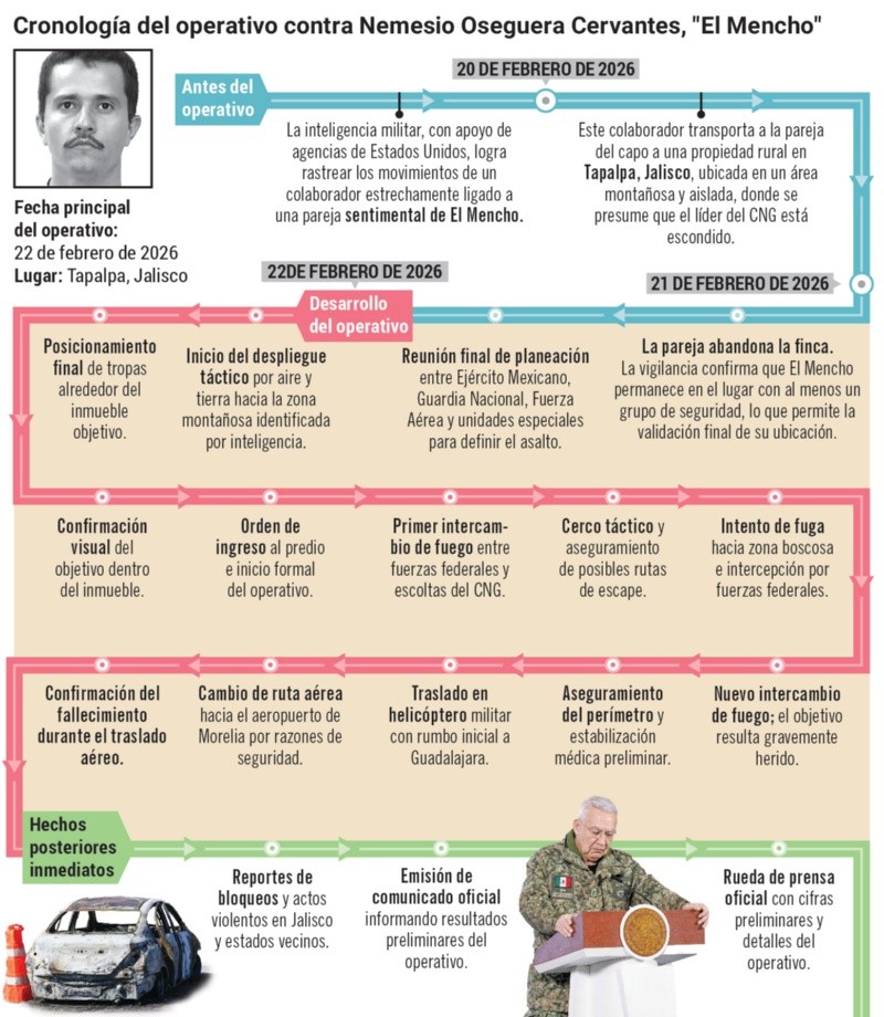 Tras el operativo militar en el que murió Nemesio Oseguera Cervantes, “El Mencho”, quien fuera líder del Cártel Nueva Generación (CNG), el titular de la Secretaría de Seguridad y Protección Ciudadana (SSPC), Omar García Harfuch, informó que las autoridades mantienen vigilancia permanente ante cualquier intento de reorganización interna de ese grupo delictivo.Durante la conferencia matutina encabezada por la Presidenta Claudia Sheinbaum desde Palacio Nacional, el funcionario explicó que elementos de seguridad operan desde un centro de mando instalado en Jalisco, con el objetivo de monitorear las acciones del cártel. Señaló que existe seguimiento puntual a varios objetivos prioritarios dentro de la organización.Al ser cuestionado sobre la reestructuración del CNG, Harfuch reconoció que históricamente, cuando caen líderes de grupos criminales, surgen nuevas cabezas. Sin embargo, aseguró que el Gabinete de Seguridad está preparado para responder a cualquier situación inmediata que pueda derivarse tras la muerte de “El Mencho”.El titular de la SSPC subrayó que la prioridad es proteger a la población. “La prioridad es la protección de la ciudadanía, estamos muy atentos con el centro de mando instalado, de cualquier tipo de reacción que haya dentro del cártel: […] estamos trabajando en el reforzamiento de la zona”, declaró.Sobre el posible reacomodo interno, el funcionario indicó que el enfoque principal de las autoridades no está dirigido al resto de los cárteles que operan en el país, sino en impedir movimientos de reorganización dentro del grupo que operaba bajo el mando de Oseguera Cervantes. También confirmó que existe un seguimiento específico sobre varios mandos de esta organización criminal. En paralelo, el Gabinete de Seguridad presentó un balance de los operativos realizados en distintas partes de la República Mexicana, en los que se reportó el fallecimiento de 62 personas.De ese total, 58 muertes ocurrieron en el Estado de Jalisco. Entre las víctimas se encuentran 25 elementos de la Guardia Nacional, un policía custodio del Penal de Puerto Vallarta y un elemento de la Fiscalía General del Estado.Además, se reportó el fallecimiento de una mujer civil. A esta cifra se suman 30 presuntos integrantes de la delincuencia organizada, quienes murieron durante enfrentamientos registrados en seis de los hechos reportados.Las autoridades reiteraron que el centro de mando instalado en Jalisco continúa operando para vigilar cualquier reacción del CNG y prevenir situaciones que representen un riesgo para la población. Harfuch afirmó que el seguimiento se mantiene activo y que las acciones están enfocadas en contener posibles efectos derivados de la reestructuración interna del grupo criminal tras la caída de su principal líder. CT