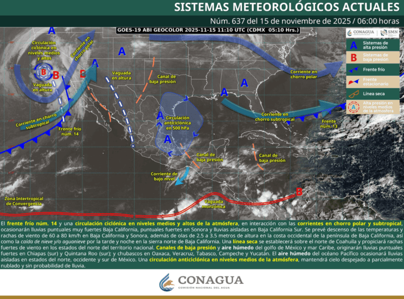El Servicio Meteorológico Nacional (SMN), fuente climática oficial del Gobierno de México, informó la mañana de este sábado 15 de noviembre sobre el frente frío número 14 y las afectaciones en el país por dicho fenómeno natural:Este día, se prevé el ingreso de un nuevo frente frío núm. 14 al noroeste del país, se asociará con una circulación ciclónica en niveles medios y altos de la atmósfera, y con las corrientes en chorro polar y subtropical, ocasionarán lluvias puntuales muy fuertes en Baja California (norte y centro), lluvias fuertes en Sonora (noroeste) y chubascos en Baja California Sur. Se pronostica un descenso de las temperaturas y rachas de viento de 60 a 70 km/h en el noroeste del México. Asimismo, existirán condiciones para la caída de nieve y/o aguanieve durante la tarde y noche de este día en las sierras del norte de Baja California.Para este día, se pronostica que el frente frío núm. 14 se extenderá en los estados del norte del país, mantendrá interacción con la corriente en chorro subtropical, ocasionando chubascos en zonas de Baja California y Sonora, así como lluvias aisladas en Baja California Sur. También, se pronostican fuertes rachas de viento de 60 a 70 km/h con posibles tolvaneras en Sonora y Chihuahua y rachas de viento de hasta 50 km/h en Baja California, Baja California Sur y Sinaloa. Además, persistirá el ambiente de gélido a muy frío en estados del noroeste de la República Mexicana. Se espera que el frente frío se desplace hacia el sur de Estados Unidos, y deje de afectar al territorio mexicano.Se espera que, para este día, ase aproxime un nuevo frente frío al noroeste de México, se asociará con una una vaguada en altura y con las corrientes en chorro polar y subtropical, ocasionando lluvias puntuales fuertes en Baja California (norte), chubascos en Sonora y lluvias aisladas en Baja California Sur, con posible caída de aguanieve o nieve en sierras de Baja California. Asimismo, se prevén rachas de viento de 30 a 50 km/h el golfo de California, Baja California, Baja California Sur y Sonora. Continuará el ambiente gélido a muy frío en estados del noroeste de México. Durante la tarde hoy y la madrugada del domingo continúa el pronóstico de la aproximación e ingreso del frente frío No. 14 al noroeste del país con probable nevada en la zona montañosa.La Coordinación Estatal de Protección Civil (CEPC) informó que dicho sistema recorrerá el territorio sonorense durante el sábado y domingo. Además, muestra un debilitamiento conforme a la cantidad de precipitación esperada.Se anticipa que las precipitaciones solo se logren dar de manera ligera a moderada para el sector noroeste y norte del estado.También mantiene una ligera posibilidad de caída de aguanieve sobre los puntos más altos de la sierra.Aun así, se espera que la masa de aire frío genere un marcado descenso en las temperaturas con amaneceres de muy fríos a fríos sobre municipios de la región montañosa y parte del norte.Asimismo, el ingreso de dicho sistema ocasionará tiempo ventoso durante este fin de semana en todo el estado de Sonora.Finalmente, se mantiene en vigilancia dos nuevos frentes fríos los cuáles ingresarán sobre el estado durante los días 17 y 19 de noviembre, mismos que reforzarán las condiciones anteriores.Protección Civil recomendó extremar precauciones ante el cambio brusco de temperaturas y mantenerse bien abrigado.Con información del Servicio Meteorológico Nacional y SUN* * * Mantente al día con las noticias, únete a nuestro canal de WhatsApp * * *OA