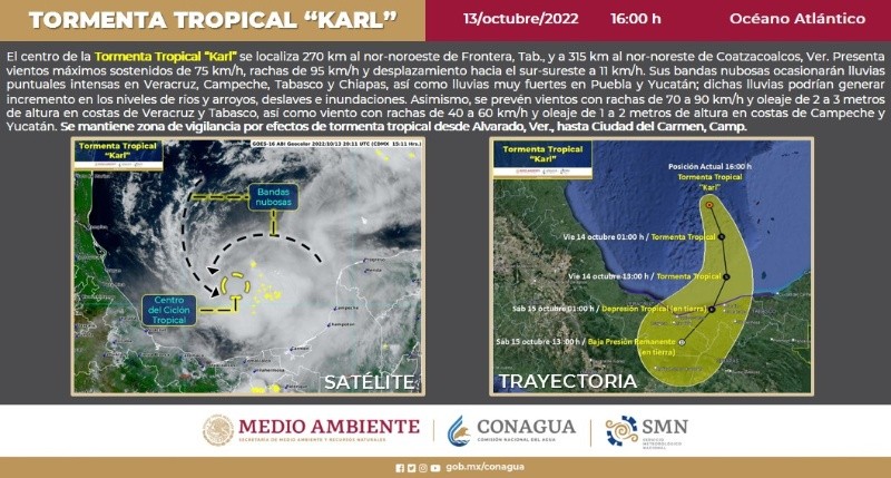 La tormenta tropical "Karl" se encontraba a las 16:00 horas a 270 kilómetros al nor-noreste de Frontera, Tabasco, y a 315 km al nor-noreste de Coatzacoalcos, Veracruz, con vientos máximos sostenidos de 75 kilómetros por hora, informó la Comisión Nacional del Agua (COnagua).La dependencia detalló en un comunicado que tiene rachas de 95 km/h y desplazamiento al sur-sureste a 11 km/h.Sus bandas nubosas, señaló, ocasionarán lluvias intensas (de 75 a 150 milímetros) en Campeche, Chiapas, Tabasco y Veracruz, así como muy fuertes (de 50 a 75 mm) en Puebla y Yucatán."Persistirá el pronóstico de vientos de 70 a 90 (m/h y oleaje de 2 a 3 metros (m) de altura en costas de Tabasco y Veracruz, y rachas de 40 a 60 km/h con olas de 1 a 2 m en el litoral de Campeche y Yucatán", añadió.En el documento se detalló que el Servicio Meteorológico Nacional (SMN), de la Comisión Nacional del Agua (Conagua), en coordinación con el Centro Nacional de Huracanes de Miami, Estados Unidos de América mantienen zona de vigilancia por efectos de tormenta tropical, desde Alvarado, Veracruz, hasta Ciudad del Carmen, Campeche."Las lluvias generadas por este sistema podrían provocar deslaves, incremento en niveles de ríos y arroyos, desbordamientos e inundaciones en zonas de los estados mencionados".Por lo anterior, las autoridades exhortan a la población y a la navegación marítima atender los avisos del SMN y seguir las indicaciones de las autoridades estatales, municipales y de Protección Civil."A la navegación marítima en las inmediaciones del sistema se la hace un llamado a extremar precauciones por condiciones de vientos fuertes y oleaje en zonas costeras".
