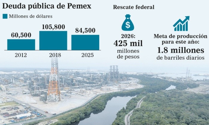 El Gobierno de México informó que en 2025 Petróleos Mexicanos (Pemex) logró reducir en 20% su deuda total, un resultado que no se había registrado en años y que ya es reconocido a nivel internacional por los mercados financieros y las principales agencias calificadoras.