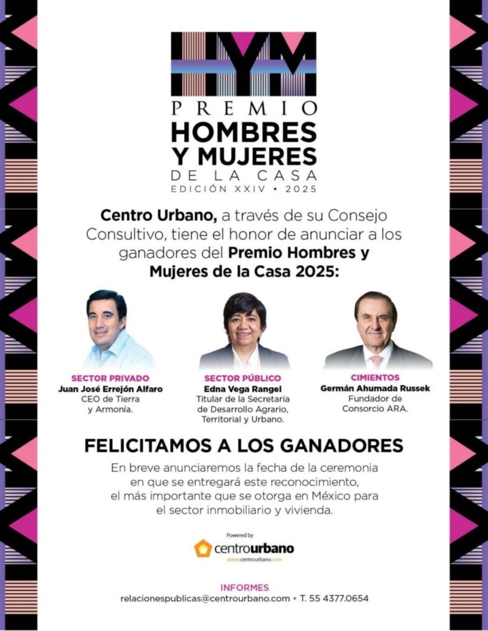 El Premio Hombres y Mujeres de la Casa, en su vigésimo cuarta edición, rendirá homenaje a tres figuras clave del sector vivienda en México, destacadas por su liderazgo, visión y contribución al desarrollo urbano del país.En esta ocasión, los reconocimientos se otorgarán a Juan José Errejón Alfaro, CEO de Tierra y Armonía, en representación del sector privado; a Edna Elena Vega Rangel, titular de la Secretaría de Desarrollo Agrario, Territorial y Urbano (Sedatu), por su labor en el sector público; y a Germán Ahumada Russek, fundador de Consorcio ARA, dentro de la categoría Cimientos.Los galardonados recibirán “La Casa de Cristal”, una escultura diseñada por el arquitecto Pedro Ramírez Vázquez, símbolo del reconocimiento que otorga anualmente el Consejo Consultivo de Centro Urbano. La ceremonia de premiación (con fecha aún por confirmar) reunirá a desarrolladores, autoridades, proveedores y representantes de los principales organismos de vivienda del país.Desde su creación, el Premio Hombres y Mujeres de la Casa se ha consolidado como un referente en el sector, al destacar el liderazgo y compromiso de quienes impulsan la vivienda como un motor de desarrollo social y económico.El reconocimiento forma parte de un proyecto de Centro Urbano que busca difundir los valores de la vivienda como herramienta de bienestar y cohesión social. Bajo la premisa de que detrás de cada gran proyecto hay un gran líder, el galardón celebra la visión de quienes han contribuido al crecimiento y fortalecimiento de esta industria esencial para México.YC