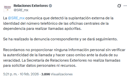 La Secretaría de Relaciones Exteriores (SRE) alertó este martes 10 de febrero sobre la detección de un intento de fraude telefónico que involucra la suplantación de su número oficial. De acuerdo con la dependencia, el número perteneciente a sus oficinas centrales ha sido utilizado de manera indebida para realizar llamadas falsas que buscan hacerse pasar por la institución y engañar a los ciudadanos. Esta práctica, advirtió la SRE, representa un riesgo directo para quienes reciben dichas comunicaciones, además de afectar la confianza en los canales formales de contacto. Aunque hasta el momento no se ha precisado cómo ocurrió la vulneración, la Secretaría informó que ya presentó una denuncia ante las autoridades competentes y dará seguimiento al caso. El objetivo, subrayó, es detener la suplantación y evitar que se repitan incidentes similares que puedan poner en riesgo a la población. EE