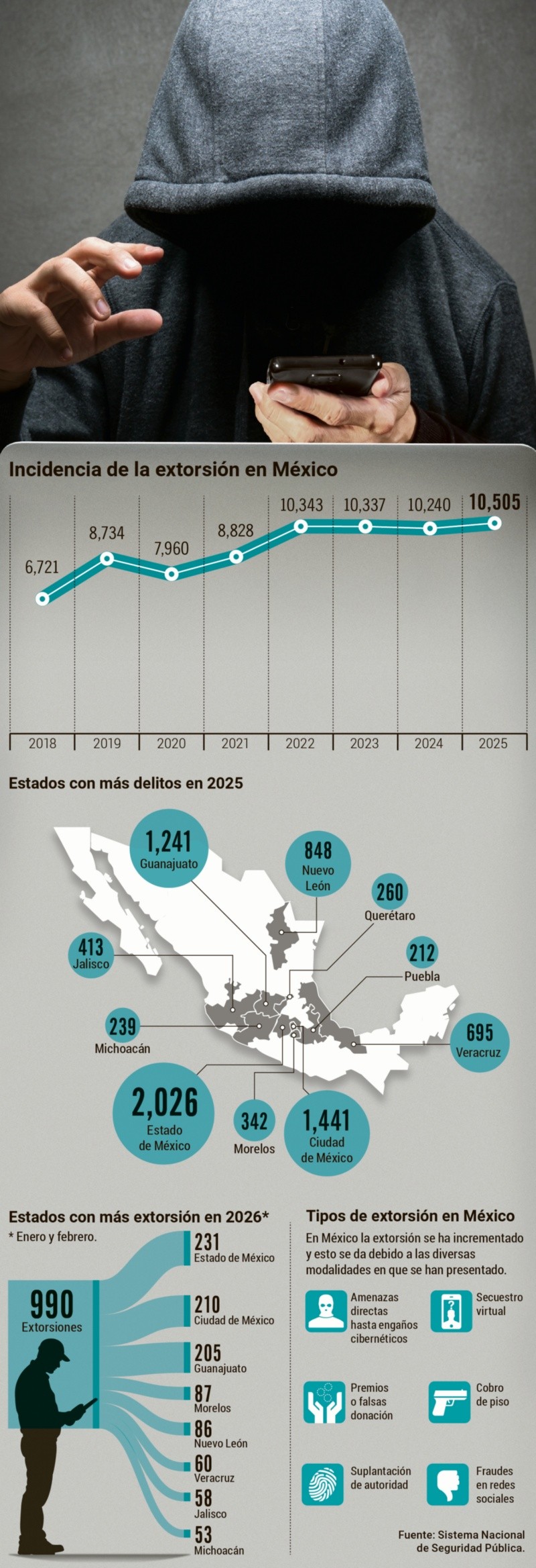 La escena dura segundos, pero refleja un problema creciente. En Avenida Aviación, en Zapopan, un camión avanza hasta que un auto se le cruza de forma repentina. El choque es leve, pero suficiente. La conductora baja, reclama y acusa: todo está calculado. Es un “montachoques”, una modalidad de extorsión cada vez más común. El caso quedó grabado y circuló en redes, pero muchas víctimas solo enfrentan presión y miedo, sin pruebas.El episodio no es aislado. Es parte de una tendencia nacional que, pese a los operativos, reformas legales y detenciones, sigue al alza. En los primeros dos meses del año, se registraron mil 337 denuncias por extorsión en México, un promedio de 22 casos diarios.Las cifras confirman el repunte. Durante 2025 se acumularon 10 mil 505 denuncias, la cifra más alta en la historia, de acuerdo con el Secretariado Ejecutivo del Sistema Nacional de Seguridad Pública. Detrás de los números hay historias como la del chofer en Zapopan, pero también comerciantes obligados a pagar cuotas o cobros de piso, estudiantes víctimas de secuestro virtual o familias enteras amenazadas por una llamada telefónica.Ante este panorama, el Gobierno federal ha buscado frenar la extorsión con una estrategia integral. En julio de 2025, el secretario de Seguridad, Omar García Harfuch, presentó la Estrategia y el Acuerdo Nacional contra la Extorsión, en coordinación con estados para homologar leyes, fortalecer instituciones y combatir la impunidad.El plan se basa en cinco ejes: perseguir la extorsión de oficio, armonizar leyes, fortalecer el 089, crear unidades especializadas en Fiscalías y unificar los procesos de denuncia e investigación. Busca que ninguna víctima enfrente sola el delito ni dependa de denunciar para que haya acción.A estas acciones se sumó, en noviembre pasado, la aprobación de la Ley General para Prevenir, Investigar y Sancionar los Delitos en Materia de Extorsión. La reforma endurece las penas -de 15 a 25 años de prisión, con agravantes que pueden elevarlas hasta 42 años- y amplía el catálogo de conductas sancionables.Sin embargo, el delito sigue diversificándose. Las llamadas desde cárceles o centros clandestinos siguen siendo clave. El secuestro virtual afecta a jóvenes jaliscienses con llamadas tripartitas que simulan privaciones de la libertad. A la par, el cobro de piso mantiene bajo amenaza a comerciantes, transportistas y productores en estados como Michoacán, Veracruz, Guerrero y Nuevo León.En algunos casos, la negativa a pagar ha tenido consecuencias fatales. La extorsión ha dejado de ser solo un delito económico para convertirse en un mecanismo de control territorial por parte de grupos criminales.El problema no se limita al crimen organizado: también involucra a autoridades. Destaca el caso del exalcalde de Tequila, Diego “N”, detenido por presunta extorsión a empresarios y comerciantes. A esto se suma la captura de José Armando “N”, “Comandante Callejas”, líder de una célula delictiva en el Estado de México.Para especialistas como Francisco Jiménez y Rubén Ortega, el reto es enorme. Coinciden en que es necesario profundizar las investigaciones dentro de los centros penitenciarios y reforzar las estrategias preventivas en las calles. La extorsión en México dejó de ser un delito aislado para convertirse en una maquinaria constante de presión, miedo y desgaste económico. Desde llamadas telefónicas hasta el cobro sistemático de piso, su expansión obligó al Gobierno federal a articular una respuesta de alcance nacional. Hoy, esa estrategia comienza a tomar forma entre reformas legales, operativos y detenciones, aunque el desafío sigue siendo mayúsculo.En julio de 2025, el secretario de Seguridad y Protección Ciudadana, Omar García Harfuch, anunció el Acuerdo Nacional Contra la Extorsión, con el objetivo de coordinar a los tres niveles de gobierno frente a uno de los delitos que más afectan a la sociedad. La premisa es cerrar espacios a la impunidad mediante reglas homologadas y una respuesta institucional más ágil.El acuerdo propone armonizar la legislación en las 32 entidades para evitar vacíos legales y consolidar unidades especializadas en las fiscalías estatales, con personal capacitado para investigar un delito que se adapta y evoluciona constantemente.Las modalidades son diversas: desde los “montachoques”, que simulan accidentes, hasta el secuestro virtual y llamadas intimidatorias desde penales o centros clandestinos. Sin embargo, el cobro de piso ha encendido las alarmas, sobre todo en sectores productivos.Un caso emblemático ocurrió en Michoacán, donde el líder limonero Bernardo Bravo fue asesinado tras denunciar cuotas impuestas por grupos criminales. El hecho evidenció la vulnerabilidad del sector agrícola y cómo la extorsión se infiltra en cadenas productivas clave, afectando también a aguacateros y otros actores del campo.La estrategia federal se basa en cinco ejes: persecución de oficio -sin necesidad de denuncia-, armonización legal, fortalecimiento del número 089 para denuncias anónimas, consolidación de unidades especializadas y creación de un manual nacional para estandarizar procesos de denuncia e investigación.A esto se suman avances legislativos. En noviembre, el Congreso aprobó la Ley General para Prevenir, Investigar y Sancionar los Delitos en Materia de Extorsión, que endurece penas y amplía agravantes. Establece castigos de 15 a 25 años de prisión, multas de 300 a 500 UMA y sanciones de hasta 42 años en casos agravados, como cuando las víctimas son menores, migrantes o en esquemas de cobro de piso.El combate también se ha trasladado a los centros penitenciarios. En diciembre, autoridades identificaron 12 reclusorios que concentran el 56% de las líneas usadas para extorsionar. Una tercera parte ya ha sido bloqueada, y se proyecta eliminar el uso de telefonía en penales federales y de la Ciudad de México para cortar esta fuente de