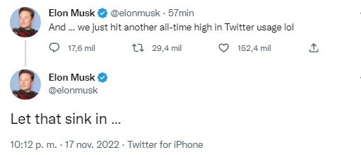Luego de que Elon Musk enviara un ultimátum a sus empleados de Twitter donde pidió comprometerse a trabajar largas jornadas para la nueva etapa de la compañía o dejar la empresa, los memes inundaron la red social.“Si estás seguro de que quieres ser parte de la nueva Twitter, por favor, pulsa sí en el enlace de abajo”, señaló el también dueño de SpaceX en el correo. “Cualquiera que no lo haya hecho para las 5pm ET de mañana (hoy jueves) recibirá tres meses de indemnización”.Lo anterior, y siguiendo con el horario estipulado por Musk, provocó que los usuarios de la red social se unieran para volver tendencia el “despido” de Twitter, con varios memes que critican la forma de dirigir de Musk, esto después de que algunos empleados compartieran un emoji de saludo, que se convirtió en un símbolo de salida de la empresa. Los antiguos empleados de Twitter también tuitearón el saludo públicamente, junto a capturas de sus chats internos.Entre los tuits que más se han destacado en la ola de publicaciones, están aquellos donde se adjuntan imágenes de clásicos memes que se burlan de la ironía de la situación, debido a que en Twitter es común que se compartan contenidos virales de acontecimientos diarios.“Adiós Twitter, cualquier cosa por Hi5”, “Adiós Twitter, hola periódico”, “Adiós Twitter, que la fuerza te acompañe”, son algunos de los comentarios de los internautas, que hacían referencia a otras redes sociales.Tras varias horas de memes y críticas en la red social, Elon Musk optó por compartir un tuit de un meme, después de escribir: "Y... acabamos de alcanzar otro máximo histórico en el uso de Twitter jajaja... Deja que esto se hunda".En las últimas semanas, Twitter ha sido tema de conversación en Internet tras la compra de Elon Musk el pasado 28 de octubre, a pesar de que la intención del magnate sea la “absoluta libertad de expresión”.Entre sus primeras decisiones, Musk despidió a los altos ejecutivos de la compañía, anunció cambios para la red social como el cobro de 8 dólares por la verificación, que ahora se retrasó hasta el 29 de noviembre.También el empresario dijo que recortaría el 75% del personal en una reunión con los empleados, según informó Bloomberg.Con información de EFE.AC